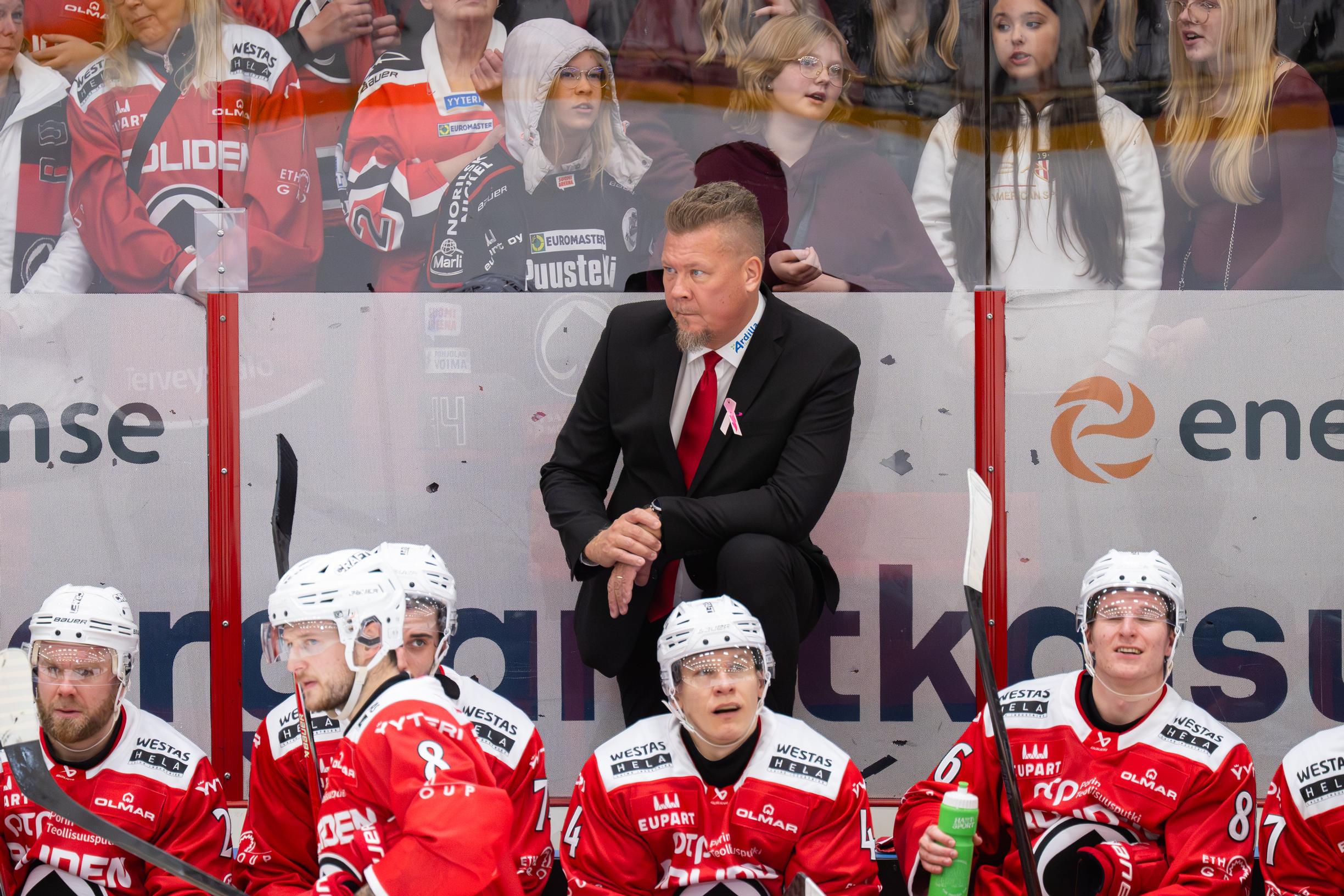 – Jos kuitenkin tällä valmennustiimillä jatketaan, ehdotan, että siellä katsotaan huolella ensimmäinen erä Ässiä vastaan. Tulee huomata, että kiekkokontrolli meni tasan 50–50, mutta Ässät syötti neljänneksen enemmän syöttöjä. Ässät pani kiekon töihin, liikkeelle, Kärpät ei. Toki kiekko polttaa nyt Kärppien pelaajien lavassa, mutta siitä huolimatta, se on saatava liikkeelle lavasta lapaan.