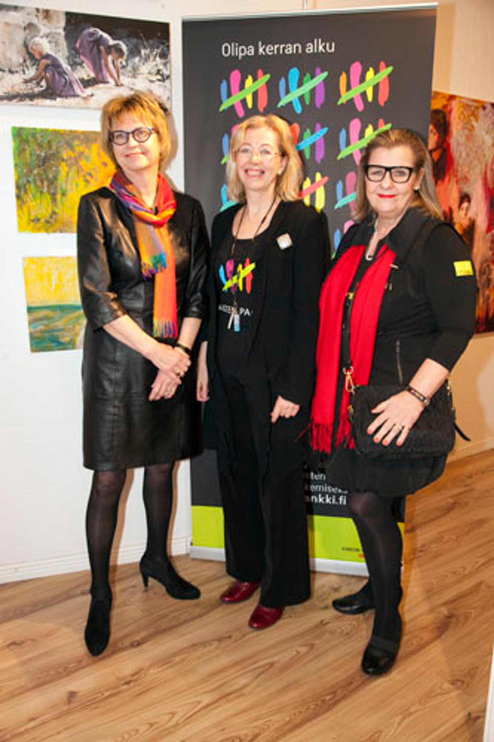 Ritva Ohmeroluoma, Satu Mehtälä ja Leena Vilppula kiiruhtivat näyttelystä kaupungintaloon Naisten Pankin vuosipäivään. Leena on perustajia, ”Liberian liikuttama” vuodelta 2007.