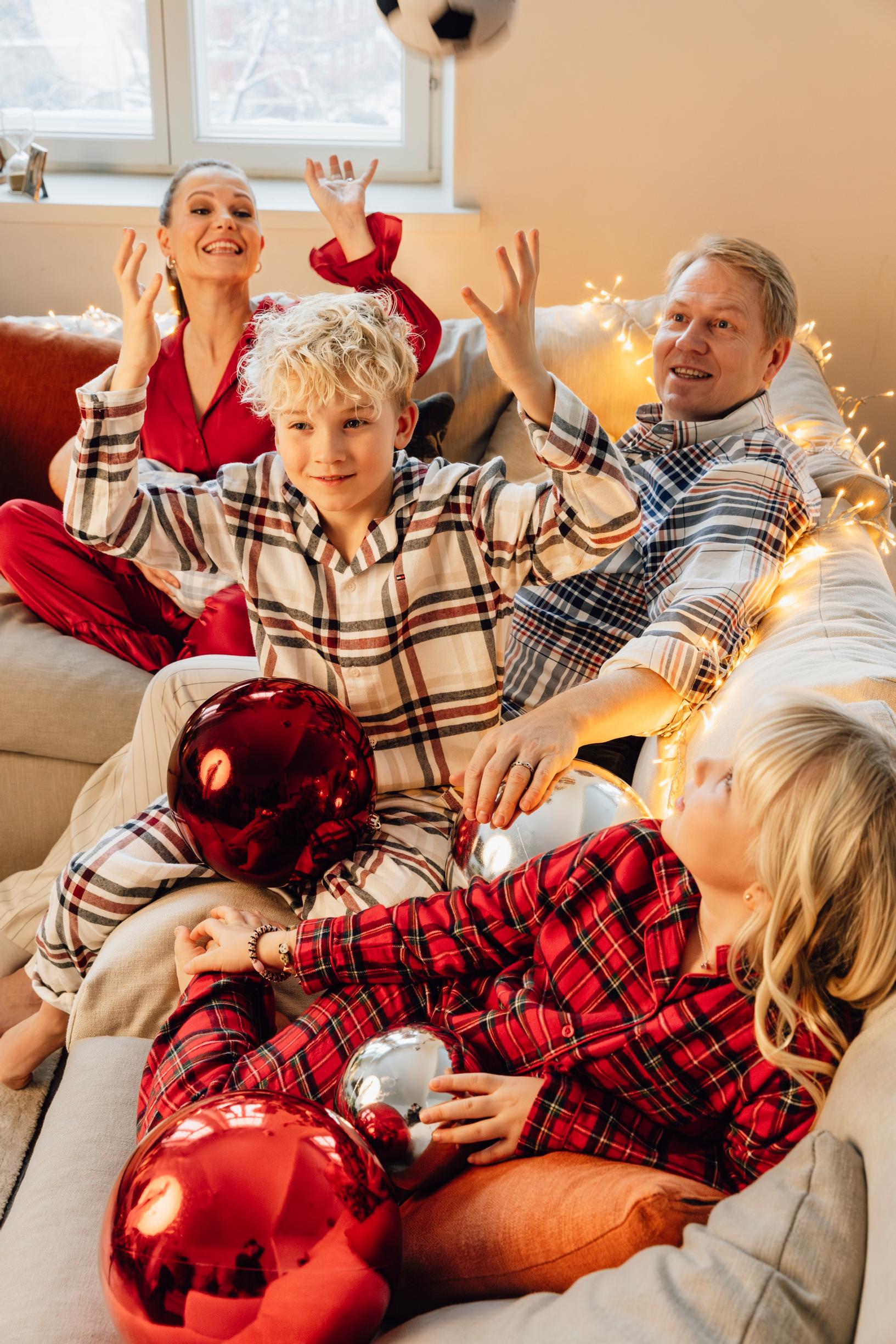 Katrin neule Ril’s. Korvakorut ja hame Muotikuu. Akin neule Vaatturiliike Sauma. Housut Billebeino. muut vaatteet: Katrin pyjama Lindex. Korvakorut Edblad. Vauvan haalari Newbie. Akin paita Tommy Hilfiger ja housut Billebeino. Olivian pyjama Lindex. Aleksin pyjama Tommy Hilfiger. Isot joulupallot Lohikari. Jouluvalot Stockmann.