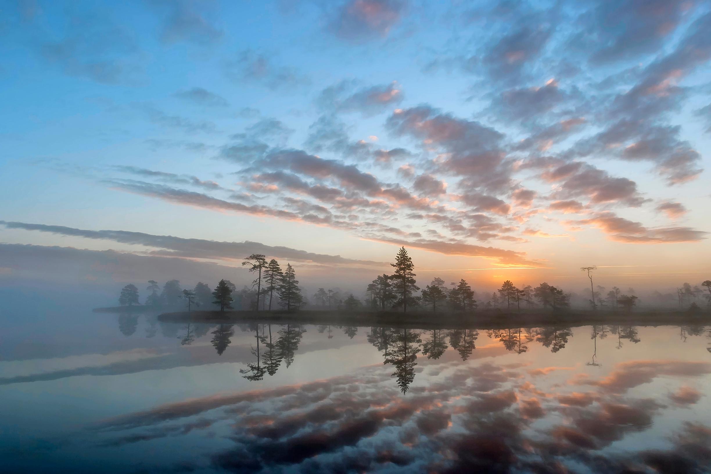 Suolampi kimaltelee rämemäntyjen väleistä. Saraikkoiset mättäät muodostavat lampeen pistäviä niemekkeitä ja lahdekkeita. Kauempana lammella korahtaa muutolle valmistautuva kuikka ja taivaalla halkoo ilmaa pitkä jono etelään matkaavia kurkia.