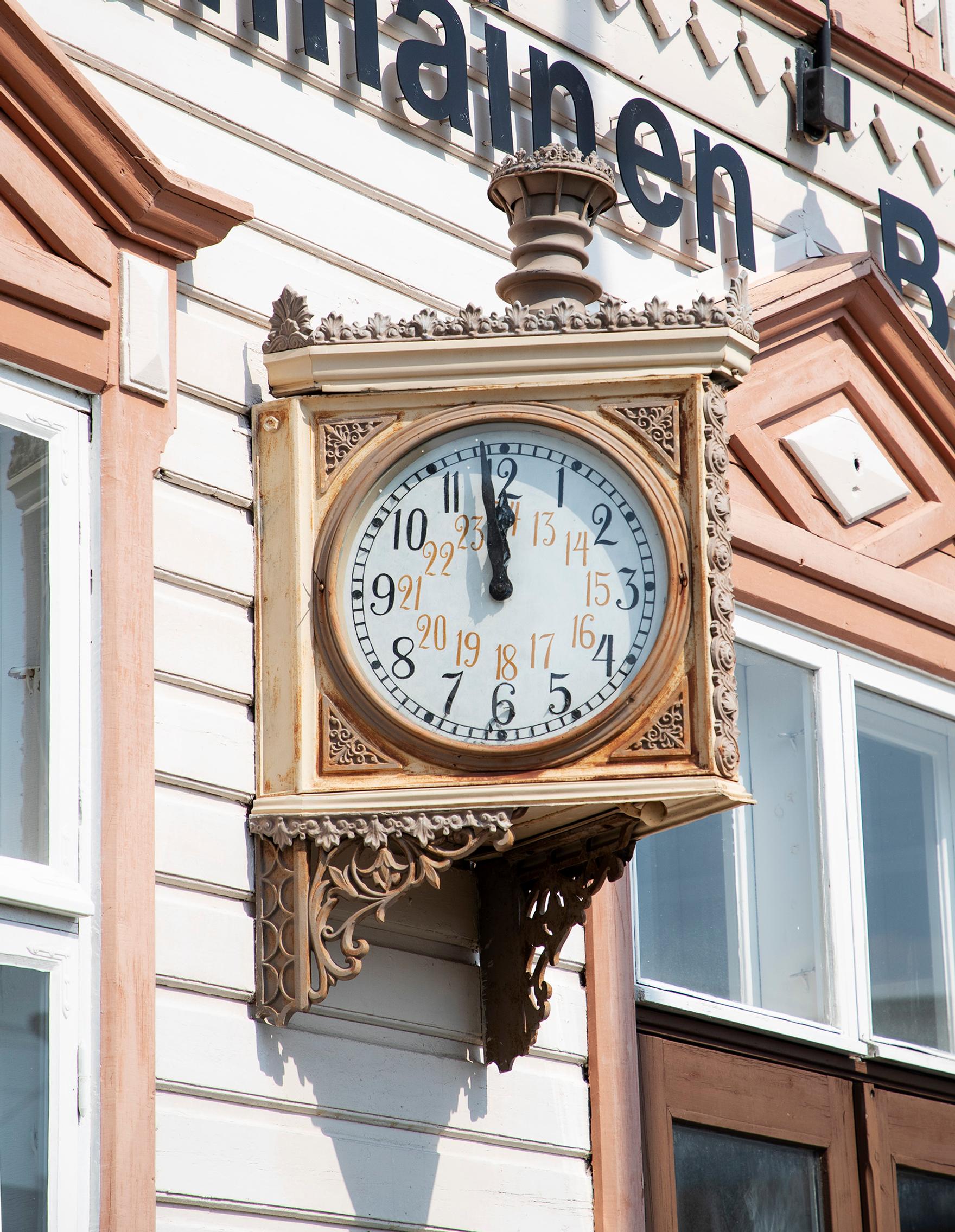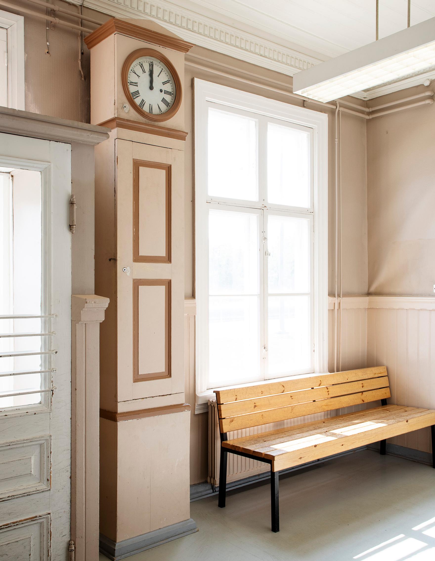 Aseman koristeellinen seinäkello on yksi harvoista alkuperäisistä asemankelloista. Samanlainen kahden kellotaulun kello löytyy Keuruun asemalta.