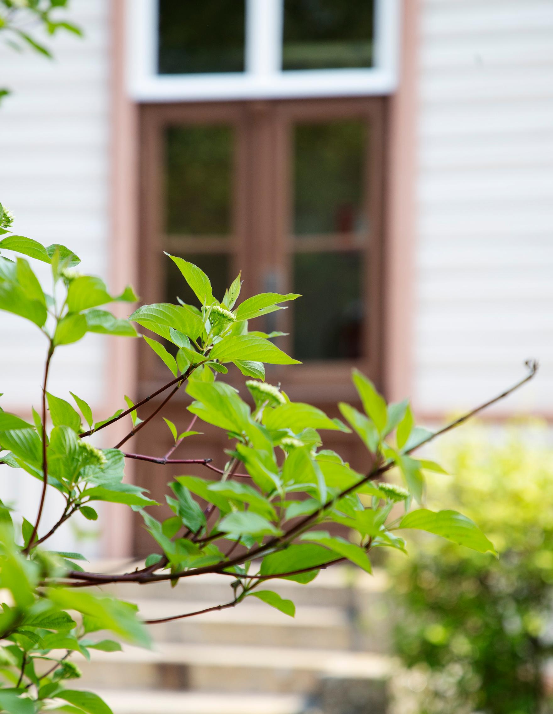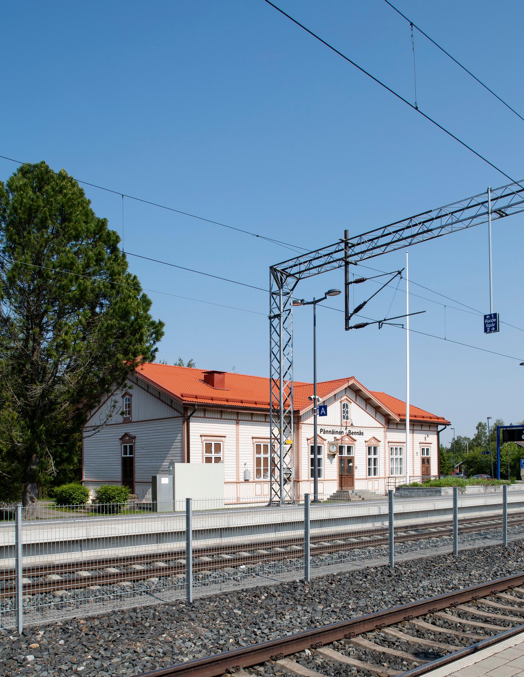 Tiheä metsä alkaa Pännäisten ratapihan toiselta puolelta. Mitään hoidettua puistoa tai puutarhaa ei aseman ympärillä enää ole, mutta naapurustossa on kauniisti hoidettuja yksityispihoja ja punamullalla maalattuja omakotitaloja. Jossain pörisee ruohonleikkuri.