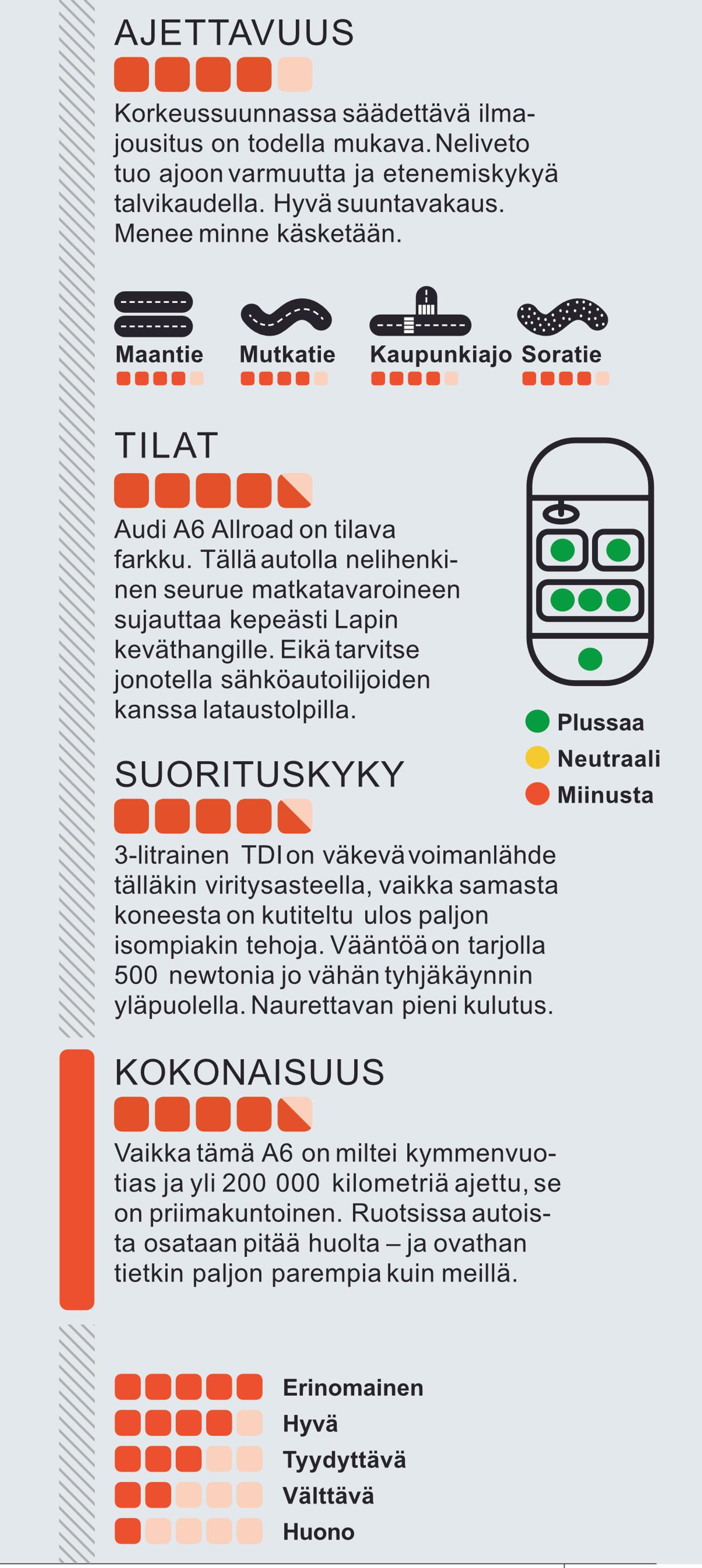 Audi oli tuontiauto, ja oli tullut maahan Ruotsista. Tässä ei ole mitään pahaa. Ruotsin kruunu on heikko valuutta, ja euroilla nyt pääsee käsiksi huomattavan mielenkiintoisiin autoyksilöihin. Allroad-Audimme oli varusteiltaan aikamoinen runsaudensarvi. Suurin erikoisuus oli ilmajousitus. Polttoainekäyttöinen lisälämmitin ja automaattivaihteisto ovat nekin aina tervetulleita varusteita. Lämmittimessä oli ajastin ja kaukosäädin. Kirsikkana kakun päällä oli vetokoukku. Sille on aina käyttöä, koska Audimme oli tietty Quattro, eli joka nurkasta raapivaa mallia.