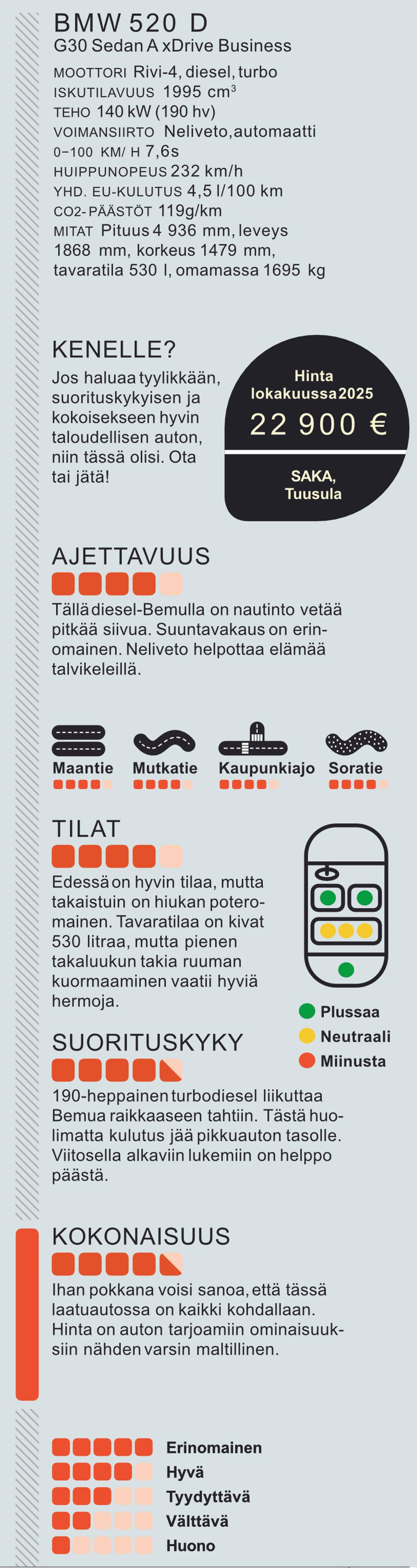 Löysimme SAKA:n valikoimista oivan vastinparin aiemmin koeajetulle käytetylle E-Mercedekselle. Se oli mikäs muukaan kuin BMW 520d. Nämä autot on suunniteltu aikoinaan kilpailemaan samoista ostajista, ja nyt käytettyjen markkinoilla kisa jatkuu edelleen kiivaana.