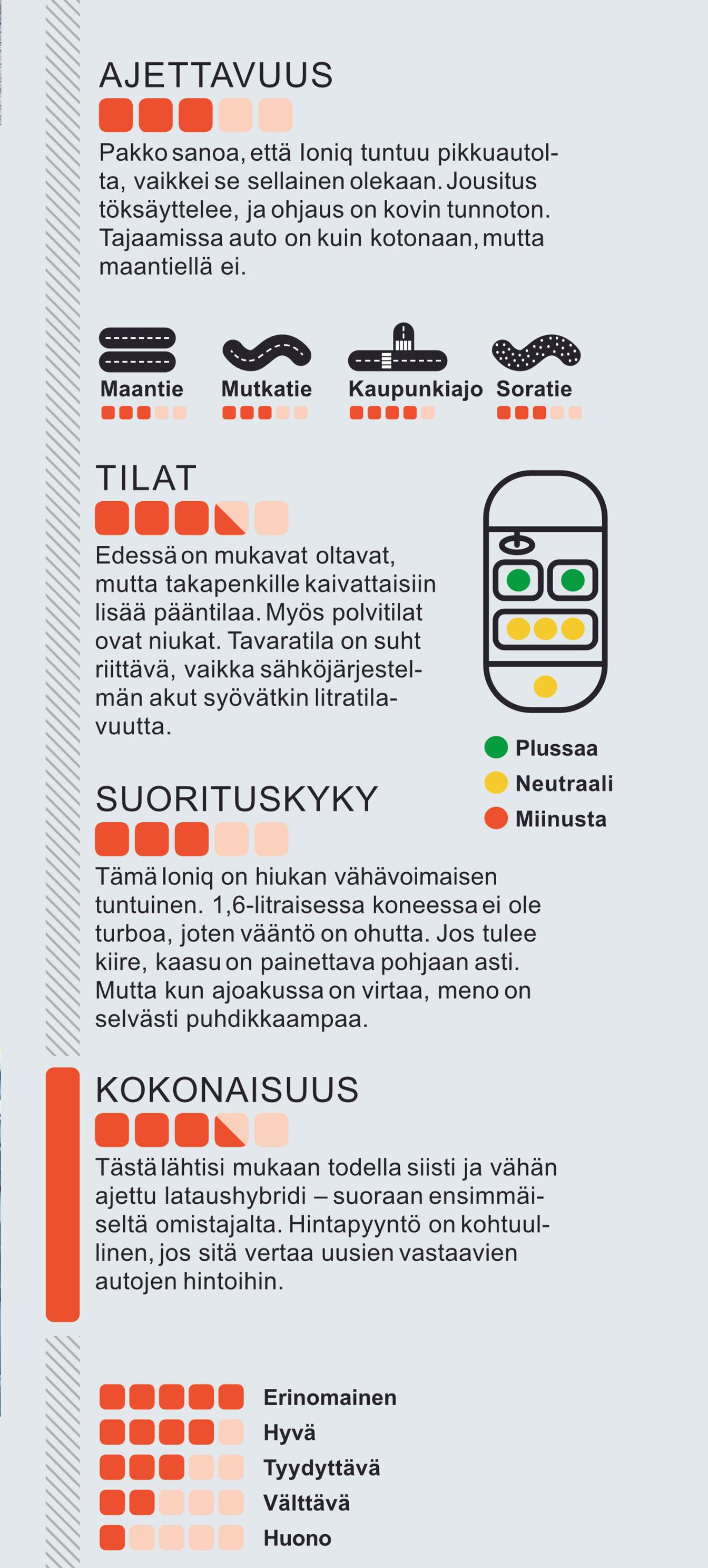 Ioniq ei ole mikään tilaihme. Edessä on toki avaraa, mutta voimakkaasti viistottu kattolinja verottaa takapenkin pääntiloja. Tavaratila on kohtalainen. Ajettavuudeltaan Ioniq on aika pikkuautomaisen oloinen. Kevyeksi tehostetussa ohjauksessa ei ole juurikaan tuntoa, ja jousitus on turhan kimmoisa.
