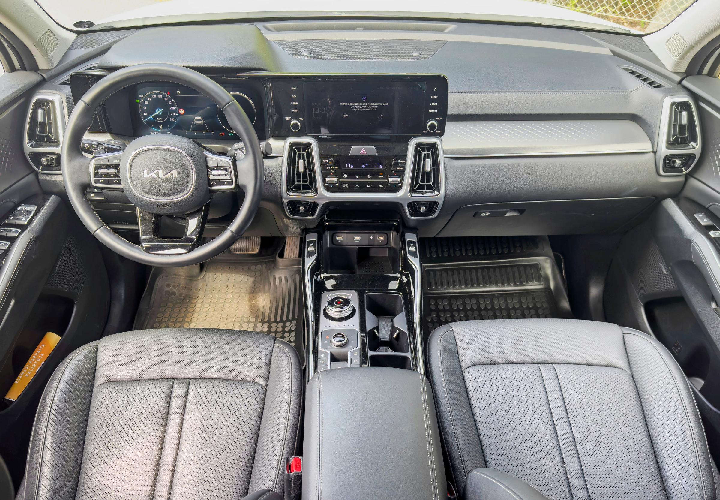 Tiloiltaan Sorento on reilu. Takapenkillä on harvinaisen avara tunnelma. Tavaratila on 809-litraisena todella kookas. Ajamamme auto oli tasoa Business Premium. Siinä on varusteina suunnilleen kaikki mitä ikinä vaan voi toivoa. Mainittakoon nyt vaikkapa mukautuva vakionopeudensäädin, Bosen poppikone, 360 asteen kamera ynnä navigointijärjestelmä.