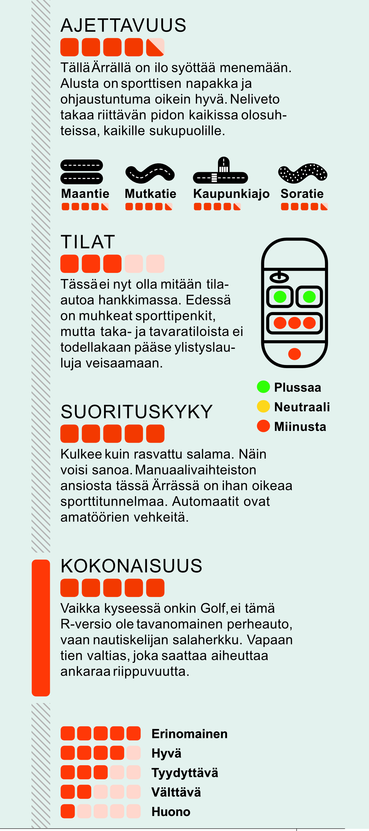 Ajettavuudeltaan Ärrä on juuri niin napakka kuin vaan voi toivoa. Ohjaus on tarkka, ja tämän auton ratissa pääsee kokemaan aitoa ja alkukantaista ajamisen iloa. Koska auto on nelivetoinen, 310 hevosvoiman teho saadaan siirrettyä hienosti tien pintaan. Ei turhaa sutimista eikä ohjauksen tempoilua.