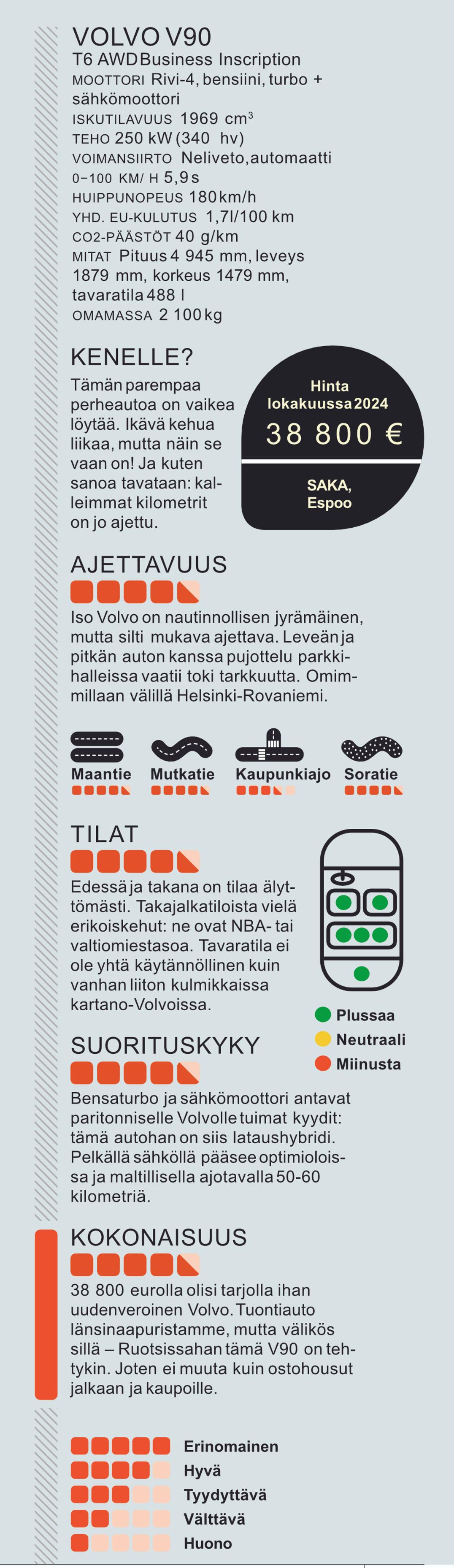 Marssimme SAKA:n halliin kartano-Volvon haavekuvat silmissämme, ja päätimme hypätä saman tien syvään päätyyn. Nyt piti saada se muhkein mahdollinen versio, eli V90. Vaikka joku muuta väittäisi, niin koolla on merkitystä. Ysikymppisessä on kokoa ja näköä vaikka muille jakaa. Kahlasimme läpi tutun SAKA-myymälän runsaan V90-valikoiman, mutta hylkäsimme heti kärkeen kaikki paljon ajetut autot – halusimme priimaa. Ja sitähän löytyi yllättävän helposti.
