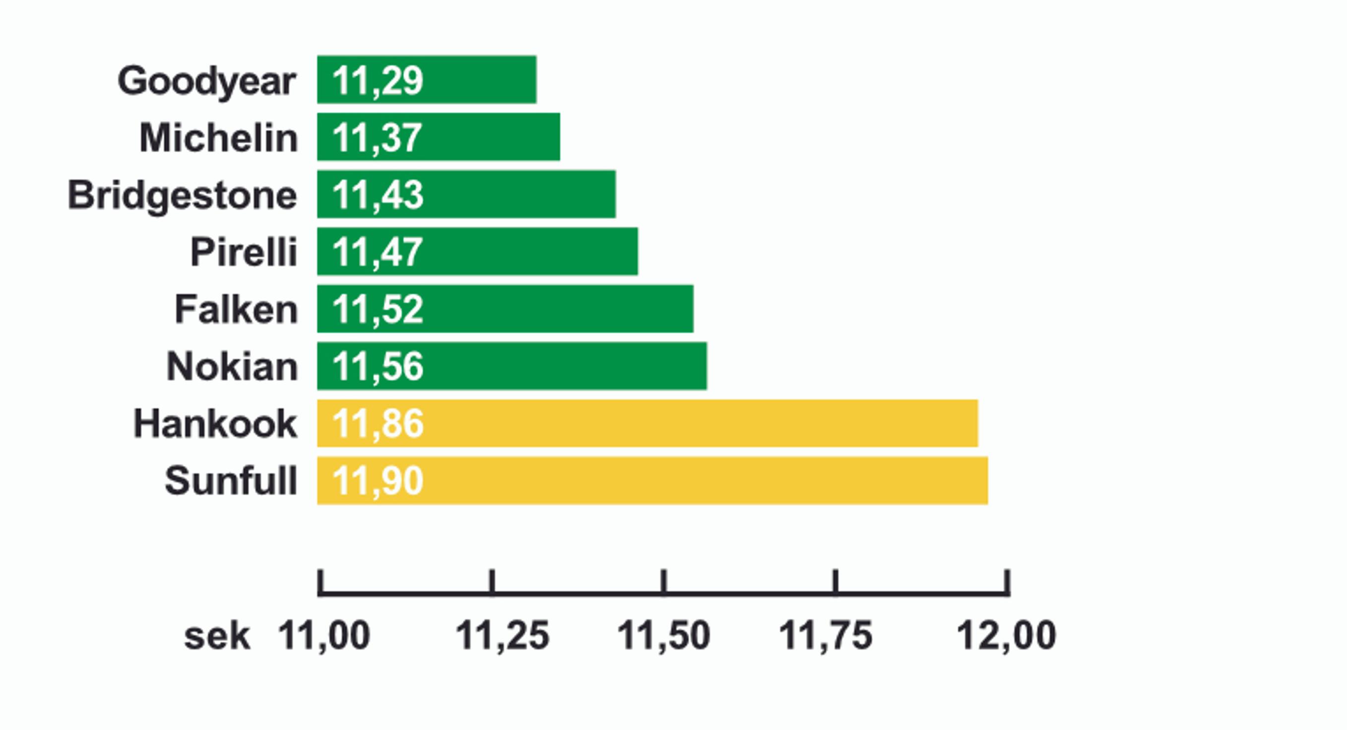 Vihreä väri grafiikassa kertoo, että rengas on erinomainen. Keltainen tarkoittaa hyvää, oranssi heikkoa ja punainen kelvotonta suoritusta.