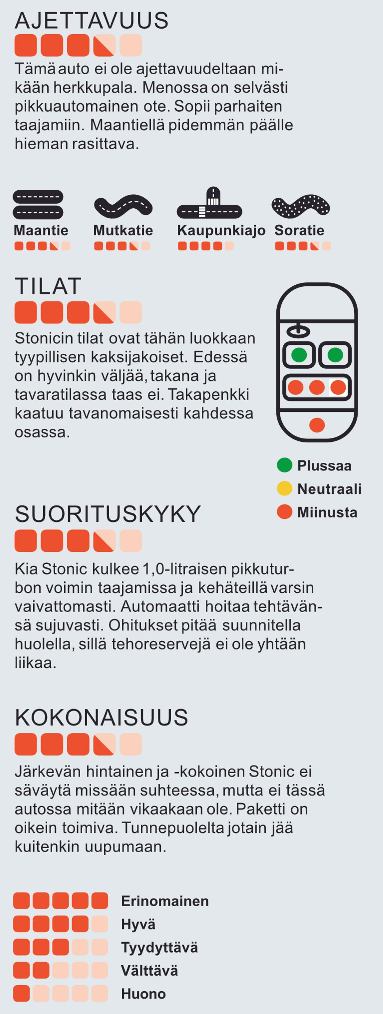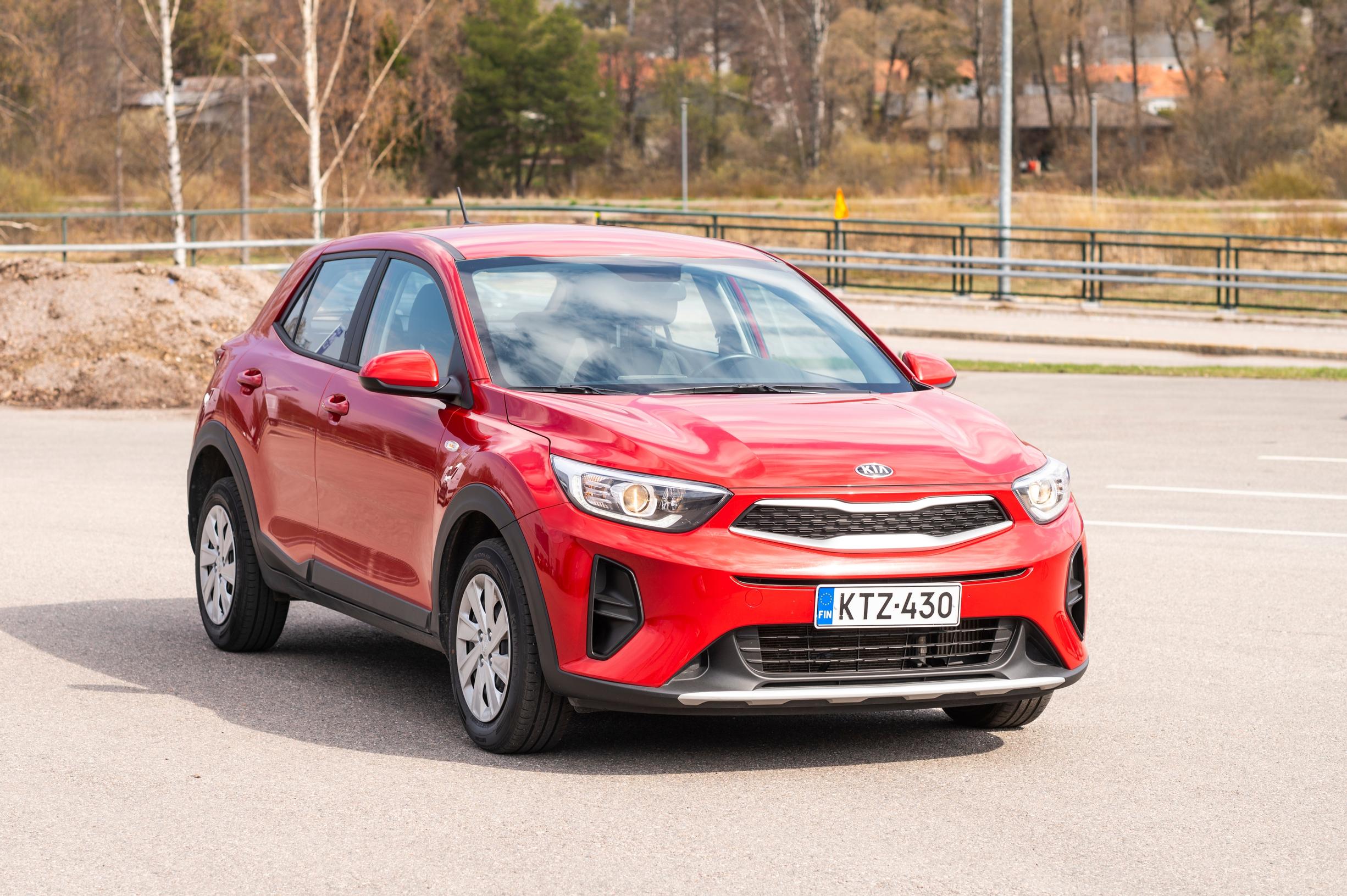 Kia Stonic on punaisesta väristään huolimatta harmaavarpunen. Sopii sinkulle, pariskunnalle tai pienelle lapsiperheelle.