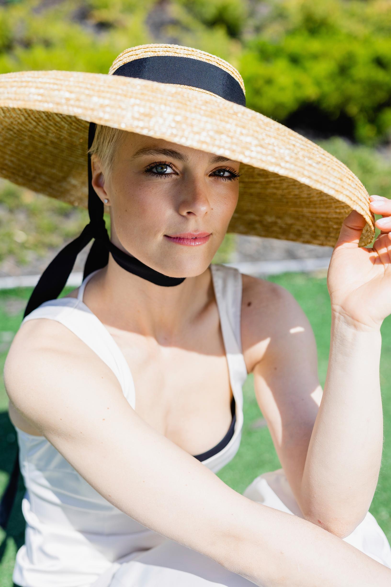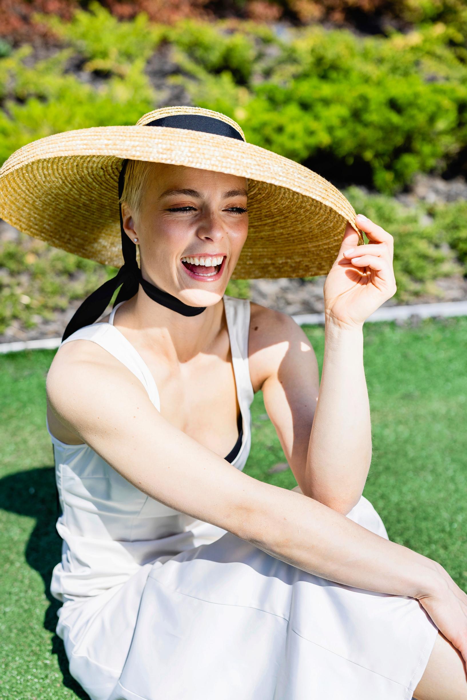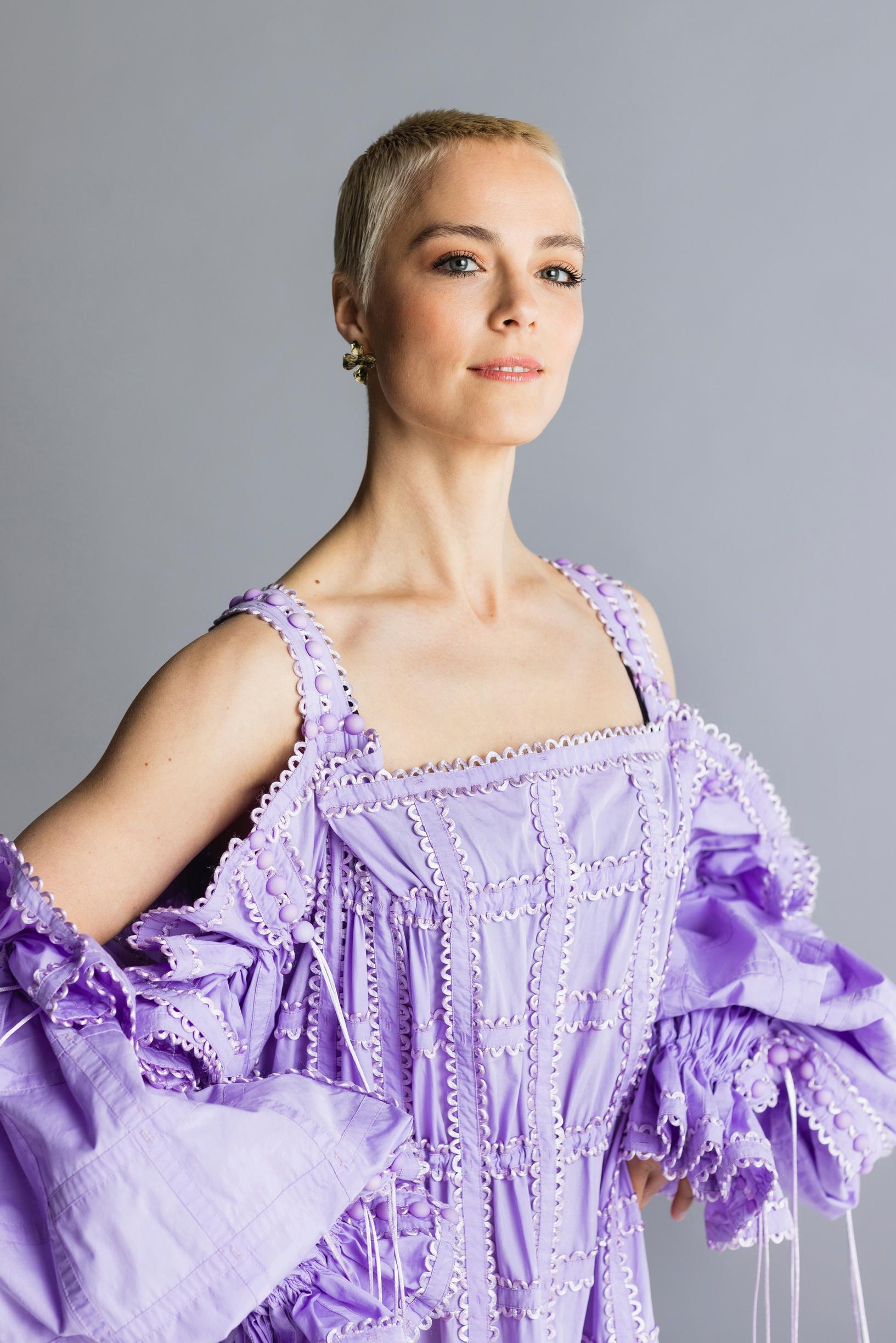 Meikki Heidi Reponen. Stailaus Maryam Razavi. Laventelin värinen mekko Sofia Ilmonen / The Ateljé, Korvakorut Glitter, Valkoinen mekko Gestuz, Nahkatakki Human Scales / Urban A, Kengät Vamsko, Hattu éN Hats.