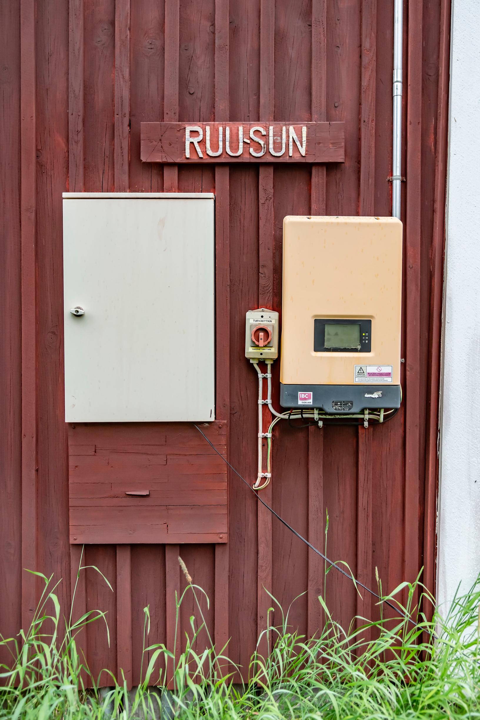 Mökin ulkoseinältä löytyy invertteri, joka muuntaa paneelien tuottaman tasavirran vaihtovirraksi. Invertterin vieressä komeilee hauska puukyltti, jossa lukee Ruusun.