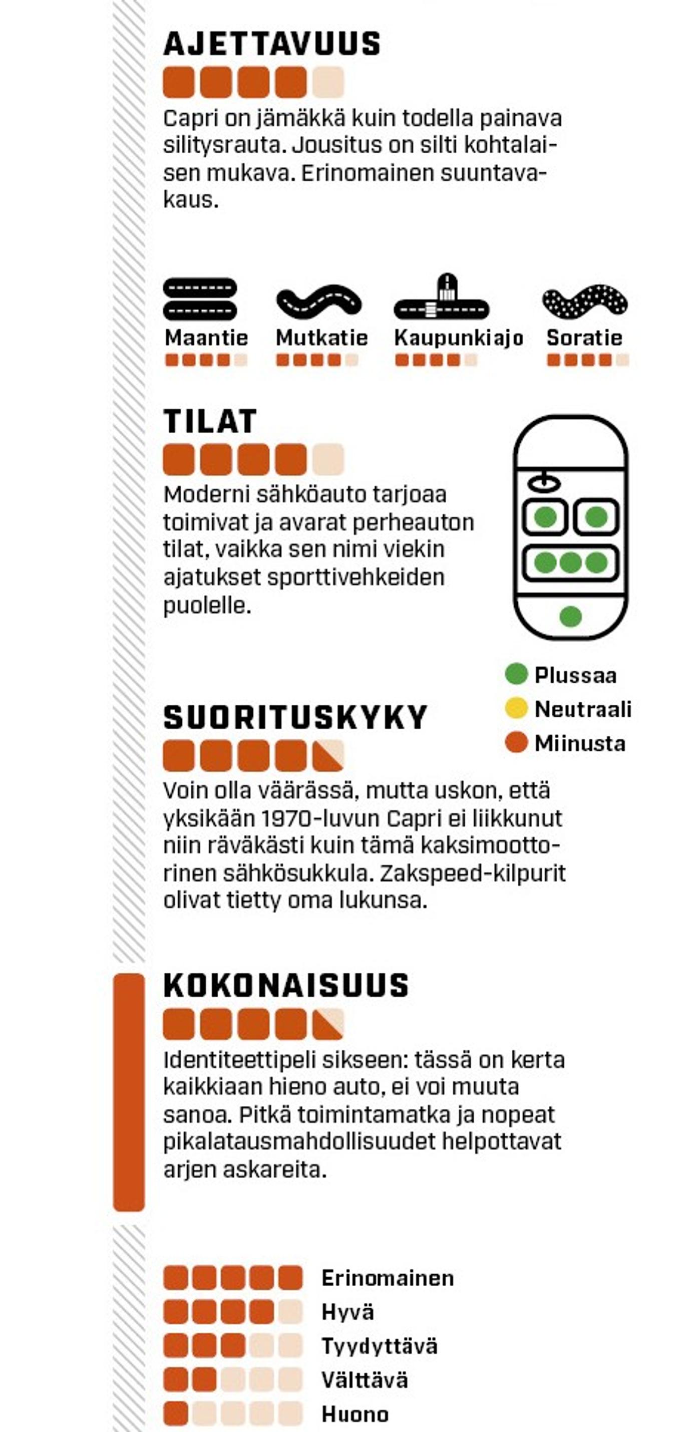 Nyky-Caprissa ei ole sinänsä mitään vikaa. Saimme ajoon ylähyllyn version, jossa oli neliveto ja muhkeat 340 hevosvoimaa. Saa ollakin tuota tehoa, kun autolla on massaa julmat 2,2 tonnia. Kovista toiveista huolimatta kevyttä ja tehokasta sähköautoa ei ole valitettavasti vieläkään keksitty. Pelkkää tehoa tärkeämpää on tietysti vääntömomentti, jota kahdesta sähkömoottorista irtoaa yhteensä 679 newtonmetriä.