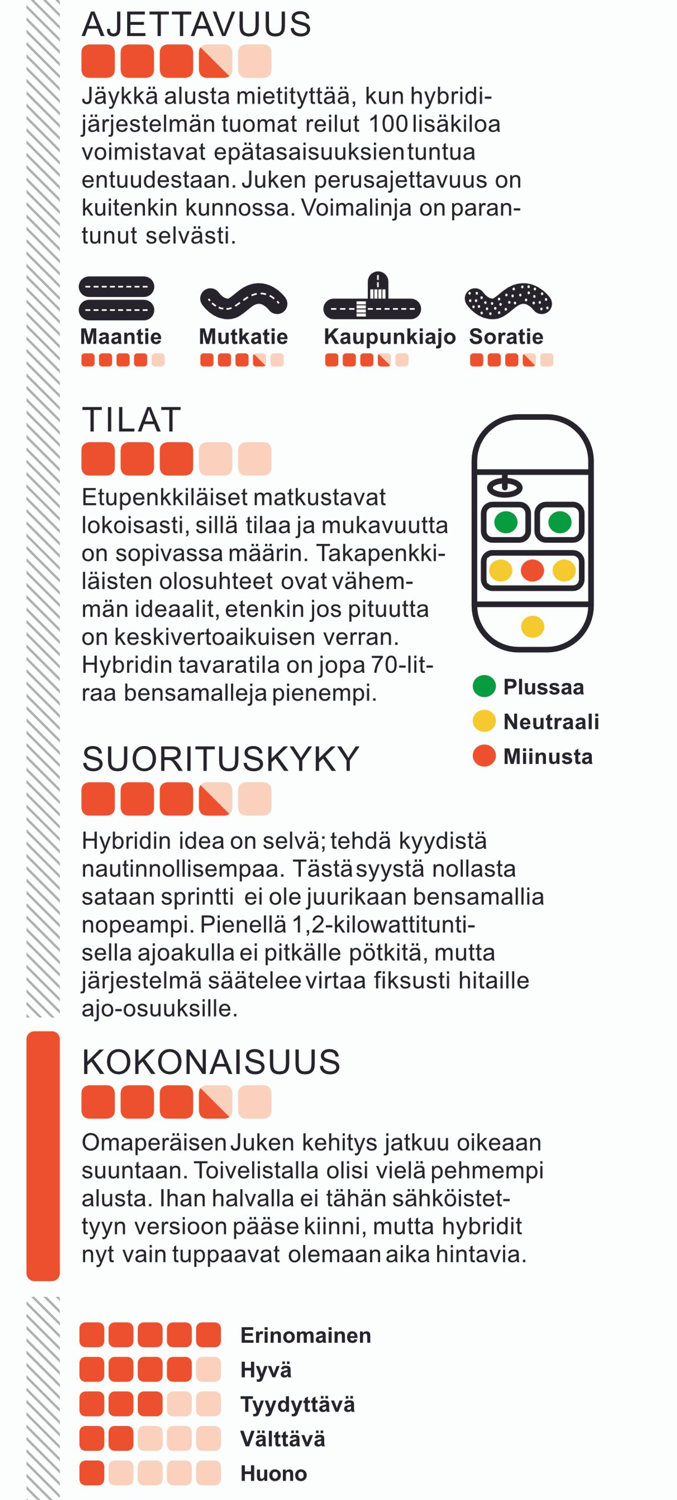 Hybridi-Jukella liikkuminen ei kuitenkaan ole merkittävästi aikaisempaa ekologisempaa. Viikon keskikulutus näytti 6,2 litran keskilukemaa, joka on vain 0,5 litraa taannoista bensa-Jukea vähemmän. Toisaalta ajamisen laadun parantuminen on jo itsessään hyvä syy hybridiversion suosimiseen.