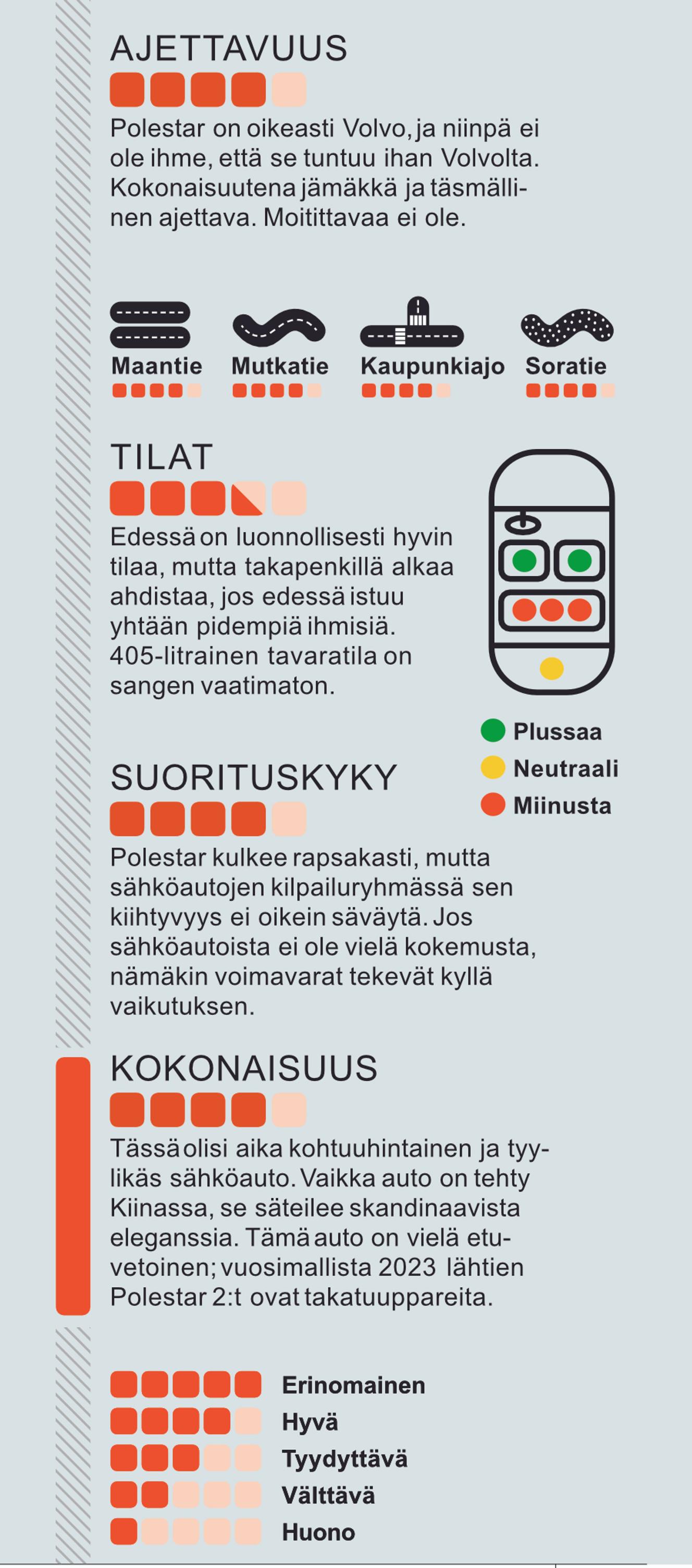 Meidän Polestarimme oli mallia 2. Polestarin mallimerkinnät ovat ihailtavan yksinkertaisia – käytössä on pelkkiä numeroita, aivan kuten Renaultilla aikanaan. Tässä autossa on yksi sähkömoottori, josta irtoaa 231 hevosvoimaa. Volvot ovat valtaosin etu- tai nelivetoisia – tämä perustason Polestarkin raapii edestä. Asiallahan ei ole sinänsä juurikaan merkitystä, mutta pilkunviilaajia tällaiset insinööripornon luokkaan kuuluvat yksityiskohdat saattavat kiinnostaa. Polestareja on toki tarjolla myös nelivetoisina, ja silloin sähkömoottoreita on kaksi. Yksi etu- ja toinen taka-akselilla. Kerrottakoon, että Volvon ladattavissa hybrideissä sähkömoottori sijaitsee nimenomaan taka-akselilla. Niinpä talviliukkailla saattaa käydä niin, että liikkeelle lähdettäessä auto irtoaa pieneen peräluistoon. Ajonvakautusjärjestelmä tappaa sudituksen heti alkuunsa, mutta tunne on eittämättä jännä.