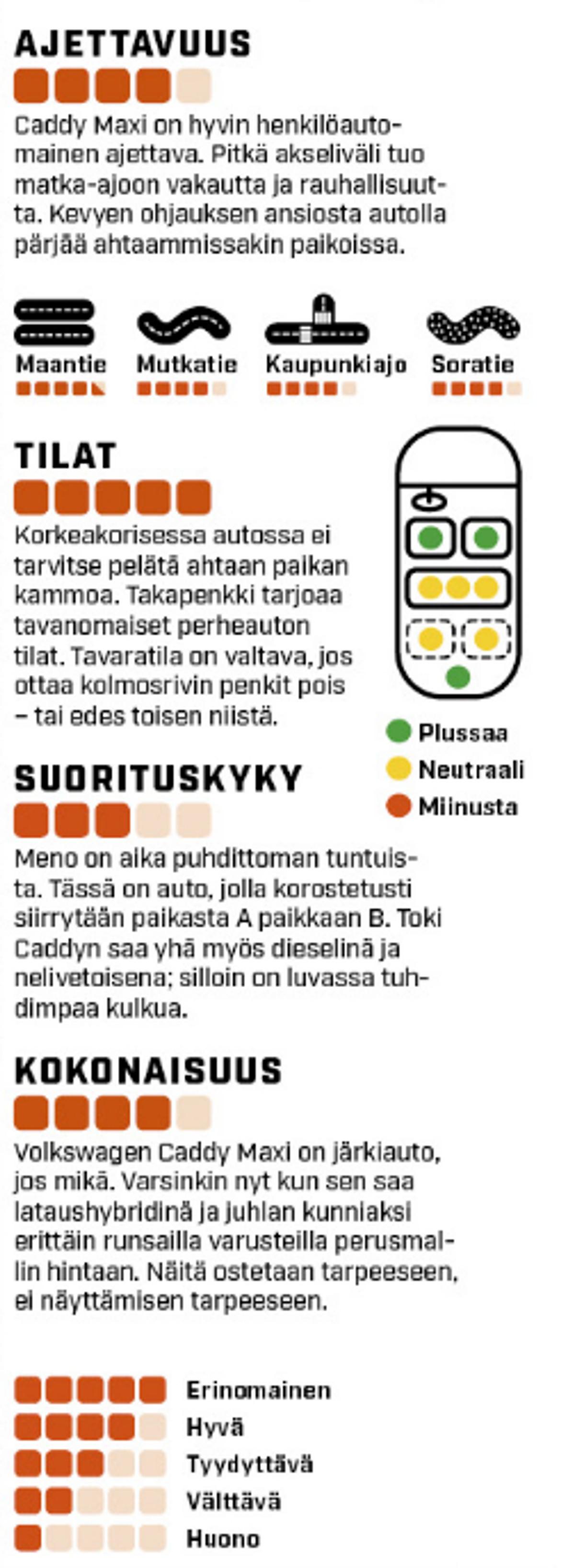 Jos tarvitsee oikeasti paljon tilaa niin ihmisille kuin tavaroillekin, Volkswagen Caddy – erityisesti pidempänä Maxi-versiona – on tyyppiesimerkki todellisesta järkiautosta. Isommatkaan katumaasturit ja SUV:it eivät pysty vastaamaan tämän hyötyajoneuvotaustaisen tila-auton mahtavaan kuljetuskapasiteettiin.