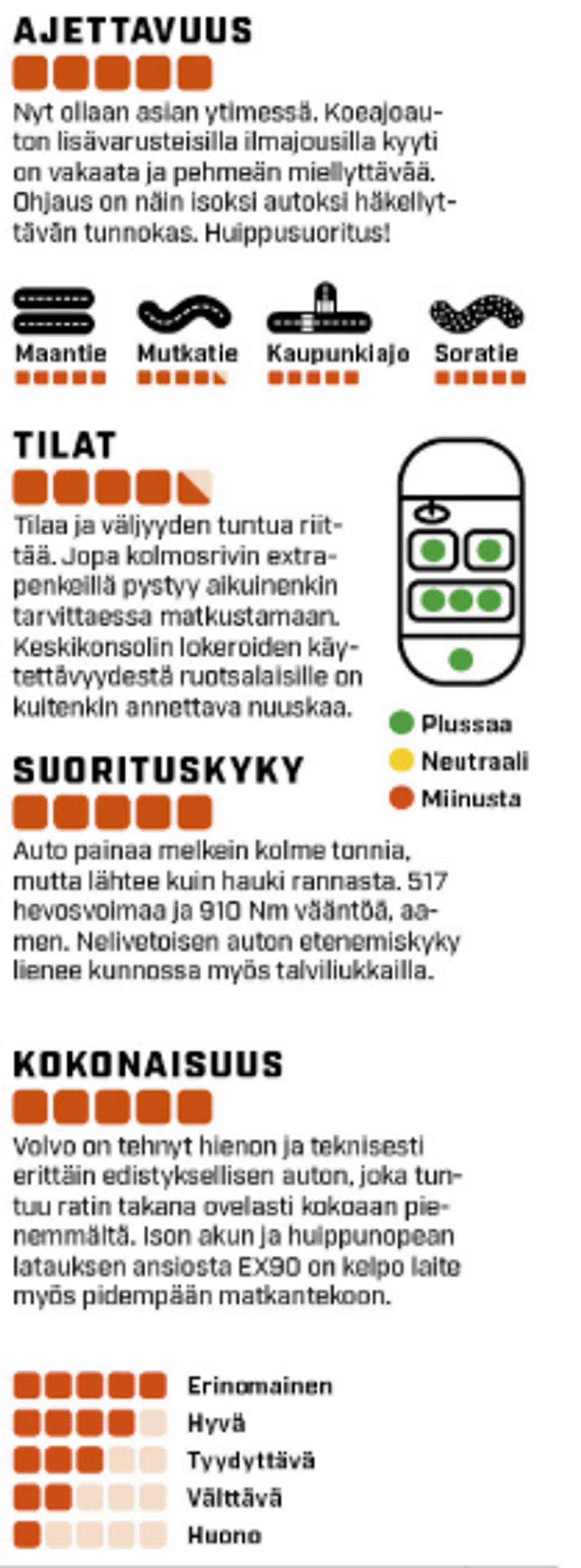 Volvo EX90 on Polestar 3:n sisarmalli, mutta hengeltään erilainen. Sähköteknisesti auto on parasta A-ryhmää; ajoakku on iso (107 kWh) ja pikalatauksen 400 voltin järjestelmä imee virtaa jopa 250 kW:n teholla.