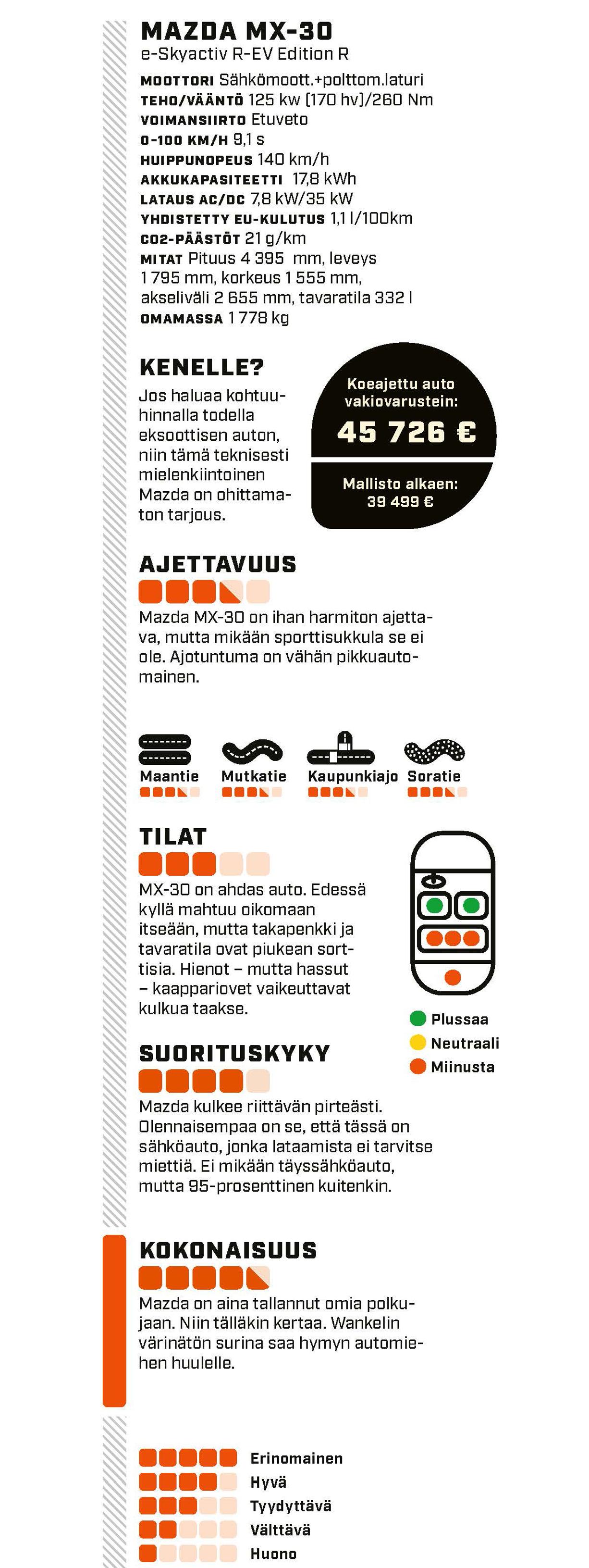 Ehkä olennaisinta Mazdan voimalinjassa on se, että latauksia ei tarvitse sen kummemmin suunnitella. Kun tankin täyttää bensiinillä, luvassa on yli 600 kilometrin toimintamatka. Erittäin kätevää, vaikka aivan nollapäästöihin ei tietenkään päästä.