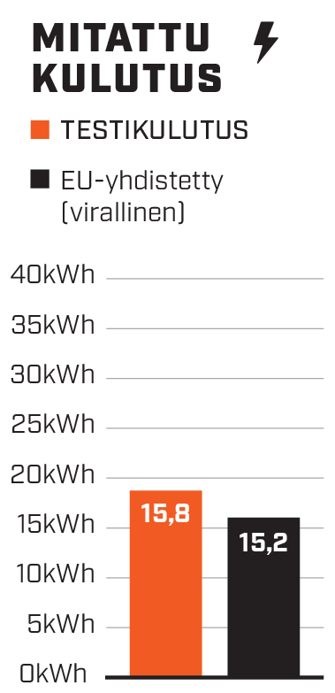 Ajotiloja 600E:ssä on kolme: eko, normaali ja sport. Niiden väliset erot ovat huomattavan selkeät, ja etenkin sport-moodissa meno tuntuu pontevimmalta. Eko-tilassa auto muuttuu kulultaan nuhaiseksi ja ilmastointimukavuus laimenee, joten yleisimmin ajotilaksi valikoituu normaali, joka onkin pätevä päivittäisajojen valinta. Auto kulutti koeajojaksolla 15,8 kWh sadalla, kun keskinopeus oli 44 km/h. Kulutuslukemaa voi pitää hyvänä, ellei jopa erinomaisen alhaisena.