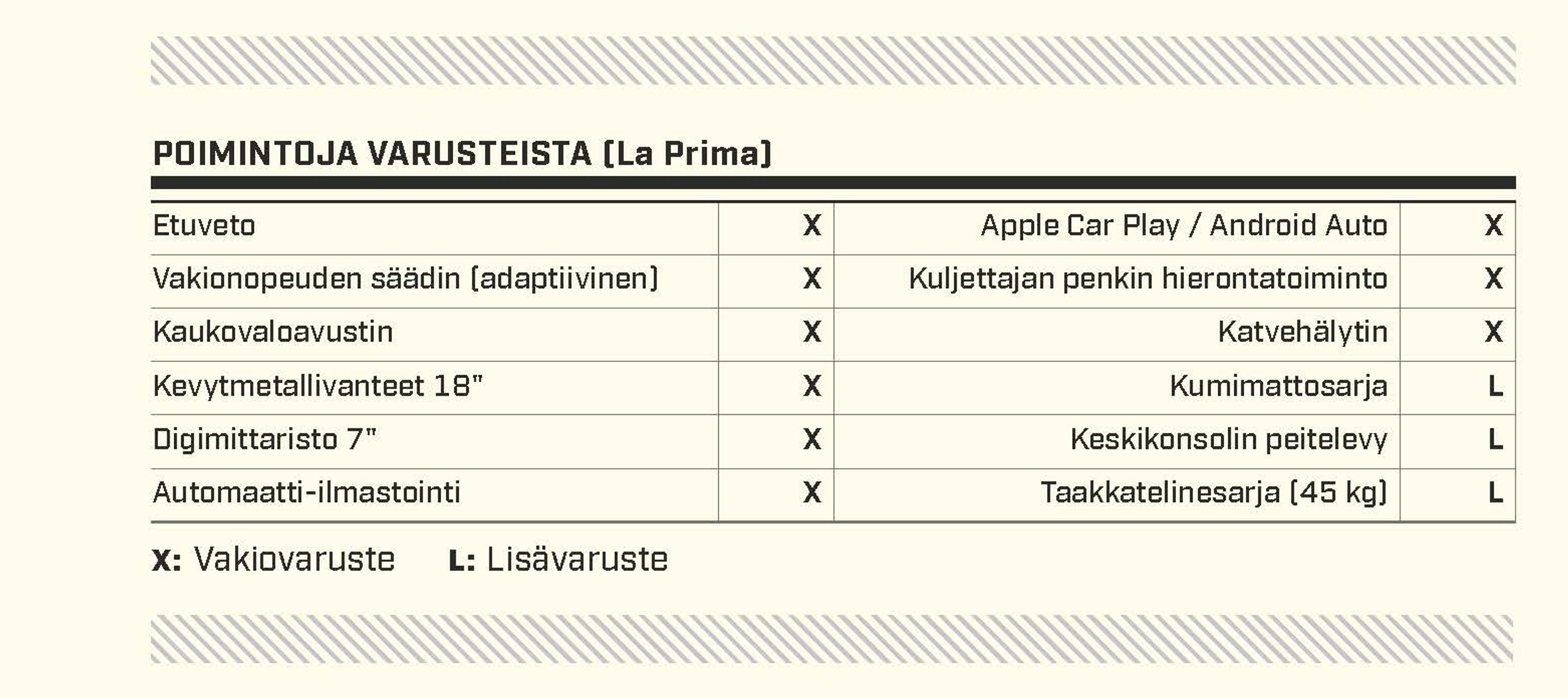 - Kattokuorma: 0 kg (lisävarusteena 35 kg)