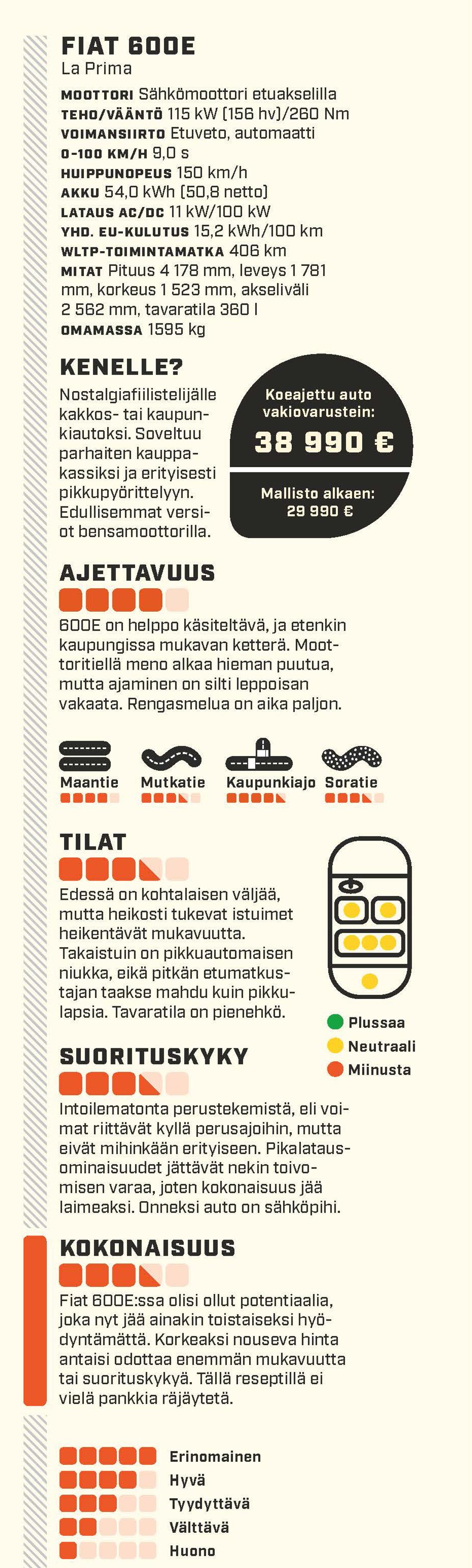 Fiat 600-mallia valmistetaan sekä kevythybridi- että täyssähköversiona. Hybridissä on tuttu 1,2-litrainen bensiinivoimanlähde (101 hv), ja sen hinta jää meillä ylimmässä La Prima -varustetasossa maltillisesti reilut viisi tuhatta euroa edullisemmaksi kuin 156-heppaisen täyssähköversion. Toisaalta edullisimpaan versioon verrattuna 600E-sähköversion hintalisä onkin sitten jo tasan yhdeksän tuhatta, mikä kertoo omaa kieltään eurooppalaisten valmistajien sähköautohinnoittelun tuskasta. Aidosti edullista sähköautoa on saatu odottaa pitkään, eikä Fiat 600E ole sellainen. Pahin kilpailija saattaa löytyä ranskalaisesta Citroën Ë-C3:sta, joka on kyllä ulkomitoiltaan hieman pienempi, mutta tarjoaa lähes samankokoiset sisätilat hätkähdyttävästi yli kymppitonnia edullisemmin. Se on paljon hintaetua.