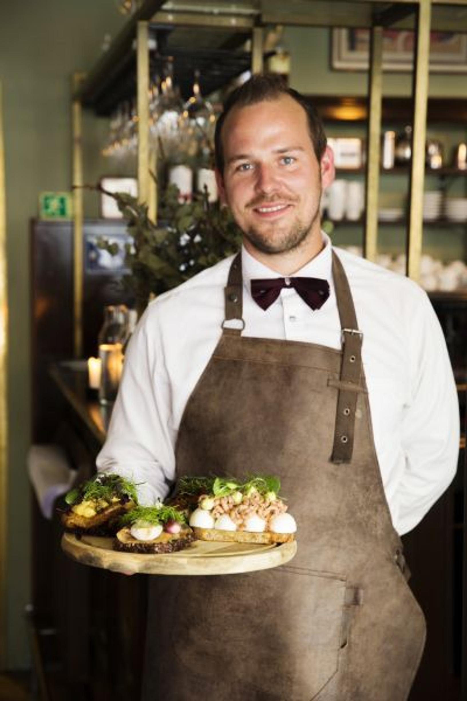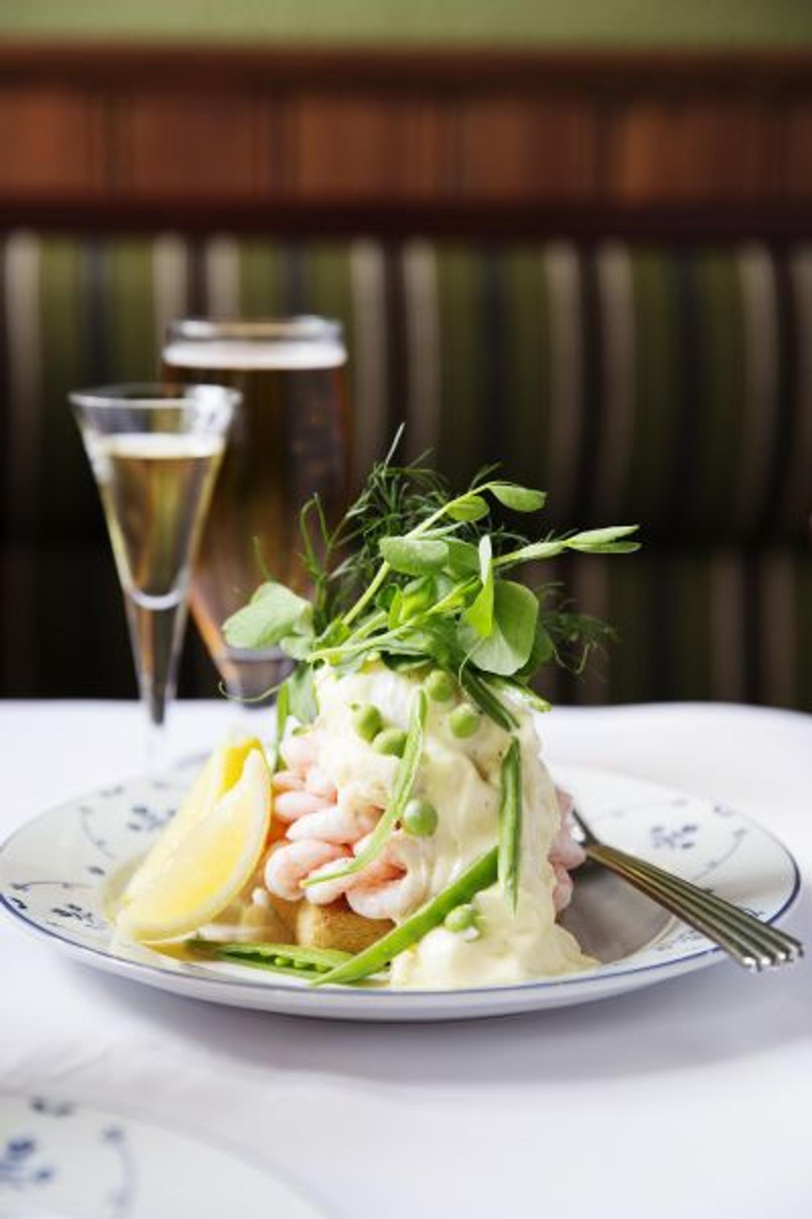 Kylmä katkarapuleipä Sans Souci -ravintolan tapaan: kananmunia, katkarapuja ja tillimajoneesia. – Suolaa ja pippuria on käytetty säästeliäästi, kertoo tarjoilija Mads Peter.
