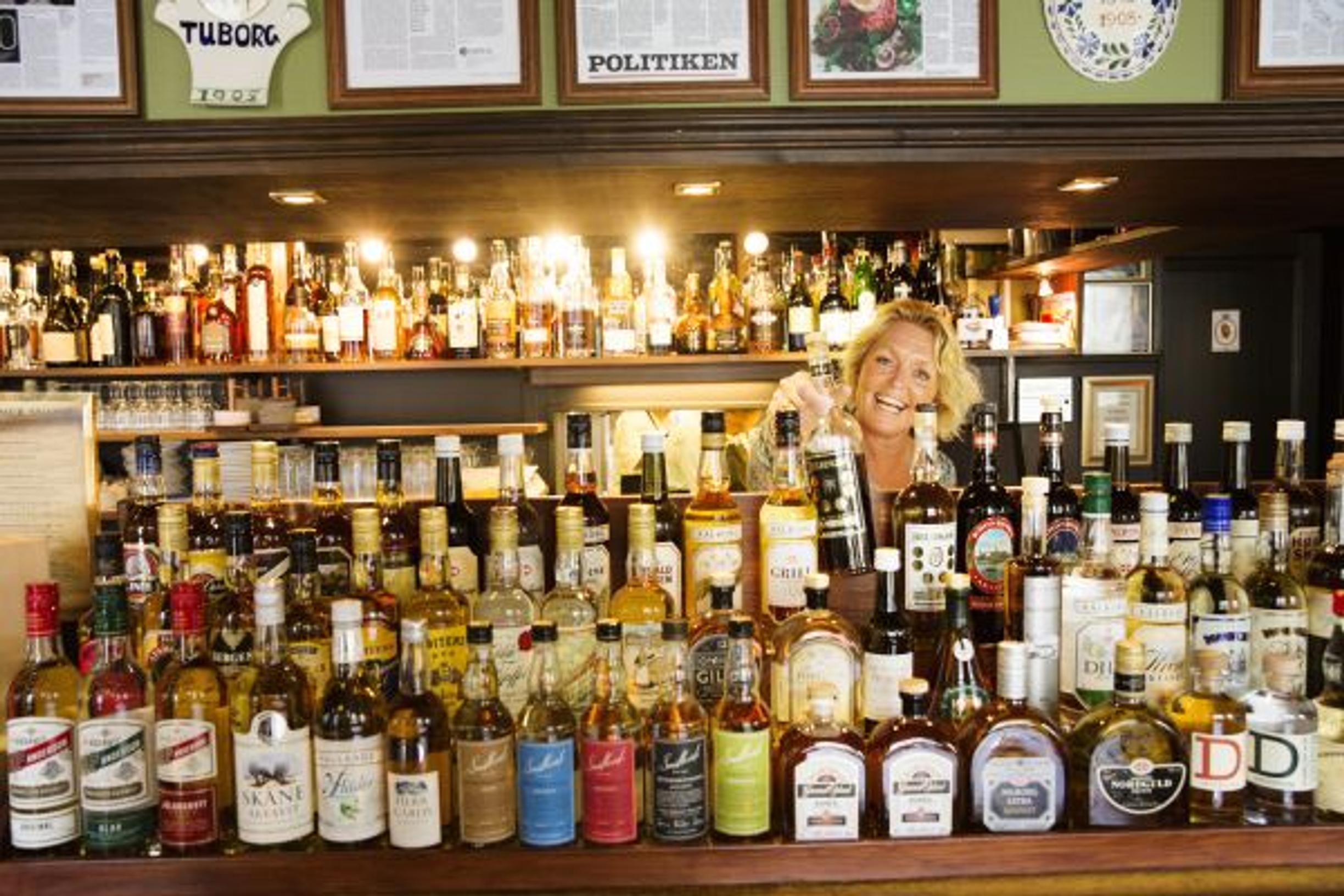 Schønnemannin ravintolapäällikön vaimo, tarjoilija Ann Bryde Tönshoff 148 snapsipullon keskellä.