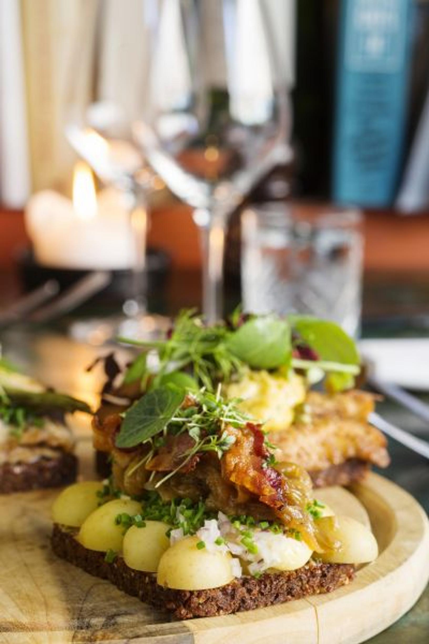 Sans Souci -ravintolan smørrebrødin täytteet on taiten valittu ja aseteltu.