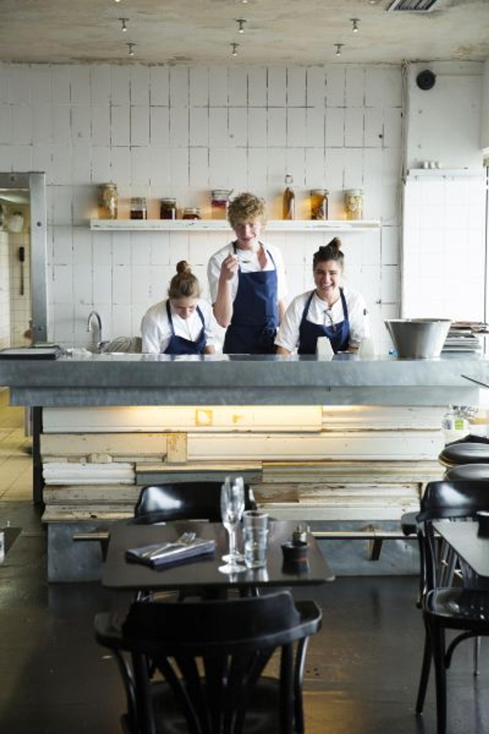 Ravintola Fiskebarenin tarjoilija Søren Thye Lange maistelee Bettina Stubbjaerin ja Serena Stranierin leipomia jälkiruokia.