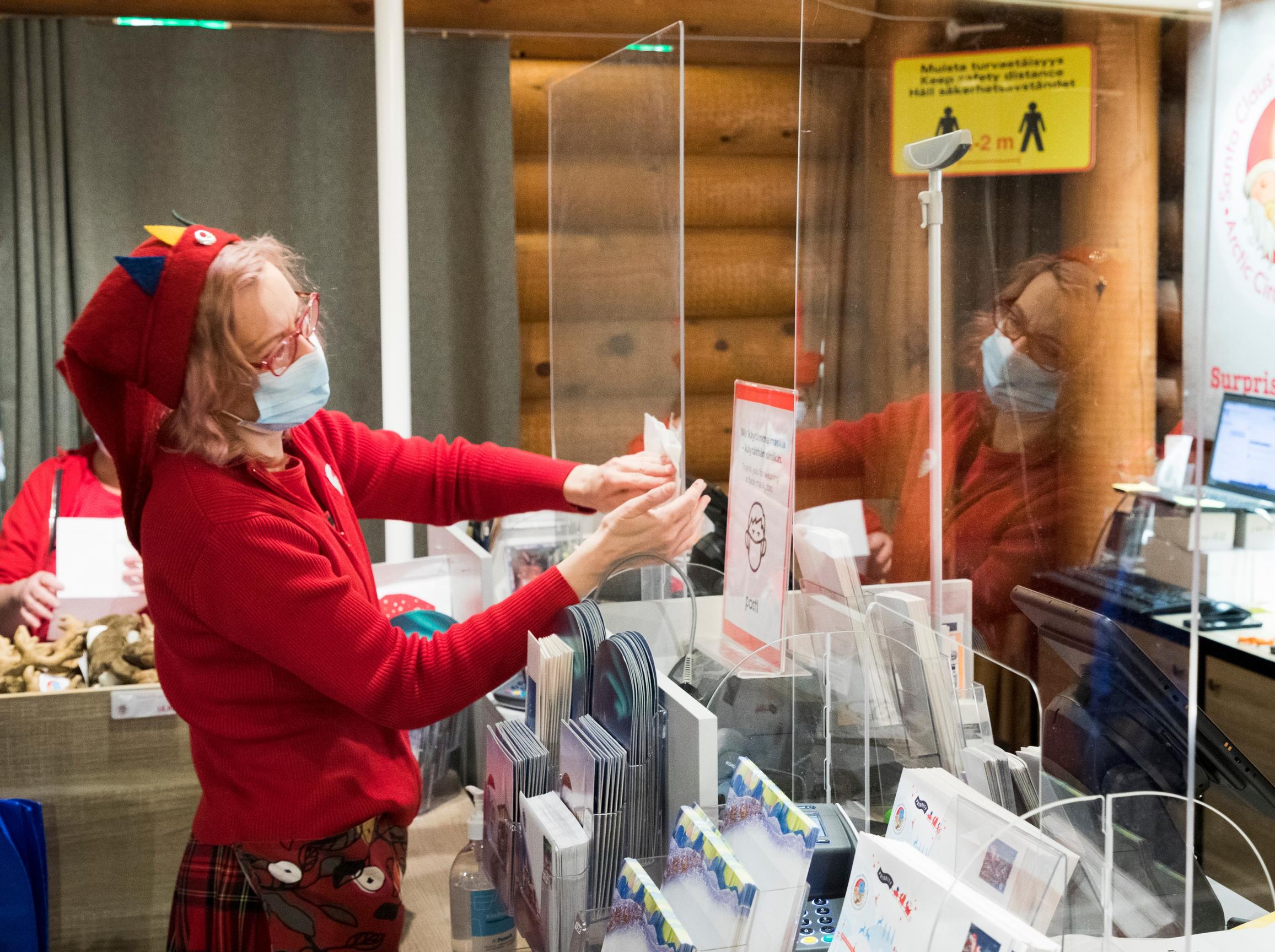 – En muista, että koskaan napapiirillä olisi ollut näin hiljaista. Yleensä tähän aikaan vuodessa täällä on jatkuva hyörinä, sanoo joulupukin pääpostissa kassan koronapleksiä puhdistava pääpostin hoitaja Katja Tervonen.