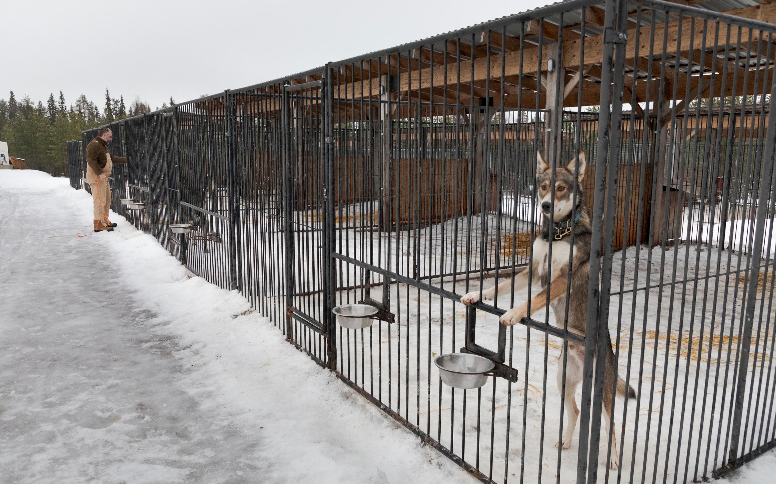 – Matkailijoita ei ole eikä valjakkoajeluakaan, kertoo valjakkoyrityksen walesilainen työntekijä Oliver Greening. Hän laittaa häkkeihin kuivikkeita ja ruokkii huskyjä, joita tarhassa on yhteensä 87.