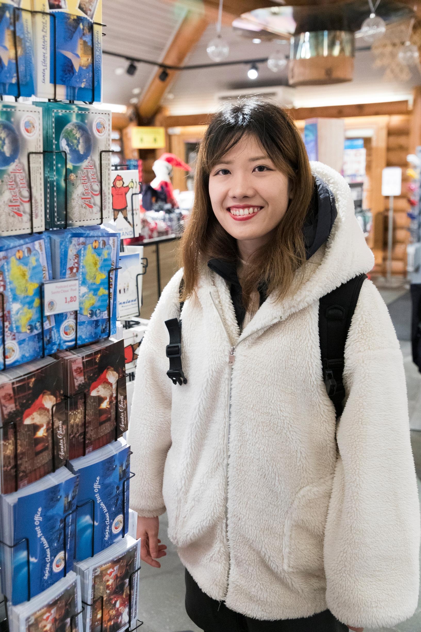 Joulukortteja ostava japanilainen Kaede Motegi kertoo opiskelevansa graafista suunnittelua Lapin yliopistossa. Viisi vuotta Rovaniemellä asunut kiinalainen kuvaa kännykkä oikeassa kädessään vasenta kättään, jolla hän sujauttaa Kiinaan lähettämänsä kortit joulupukin postin postilaatikkoon.