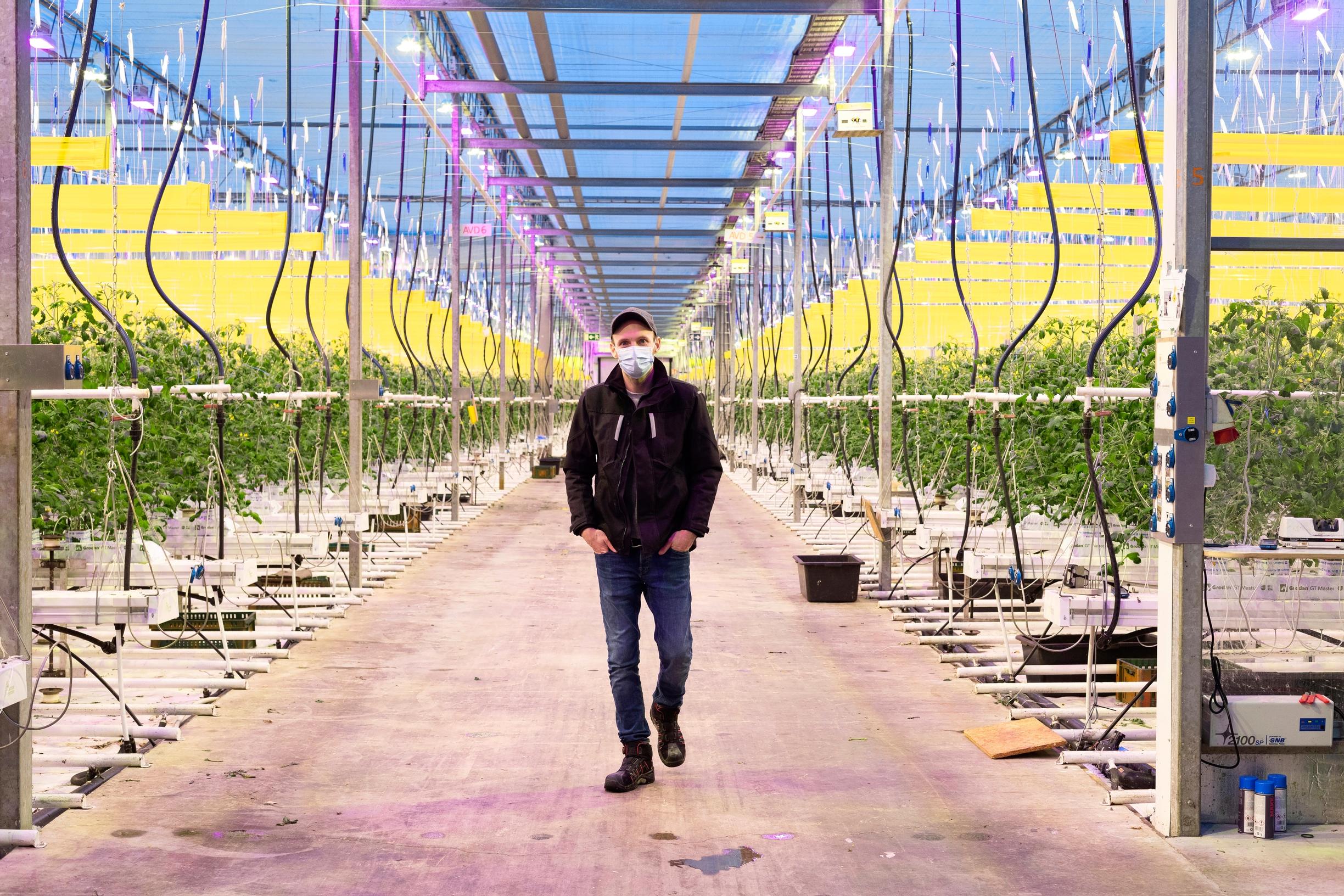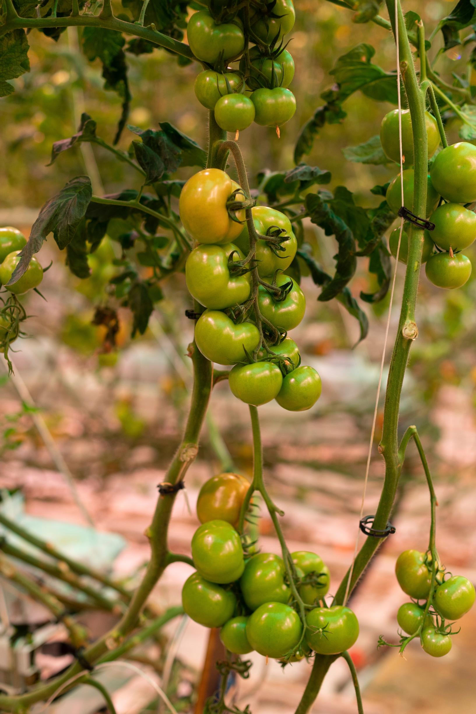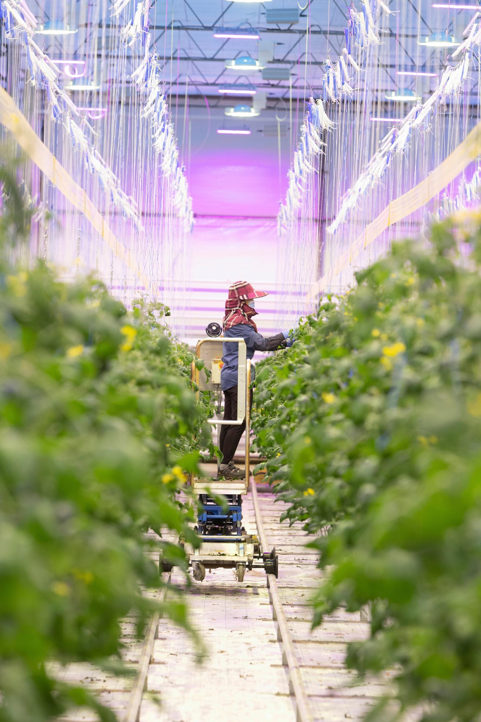 Oven takana avautuu toinen maailma. Kirkkaat led-valot tekevät värimaailmasta punertavan. Lämpöä on päiväsaikaan 23 astetta. Lämmitysjärjestelmän polttoaine on kauran kuori, myllyteollisuuden välituote. Tomaattitarha on siis hyvä esimerkki nykyaikaisesta kiertotaloudesta.