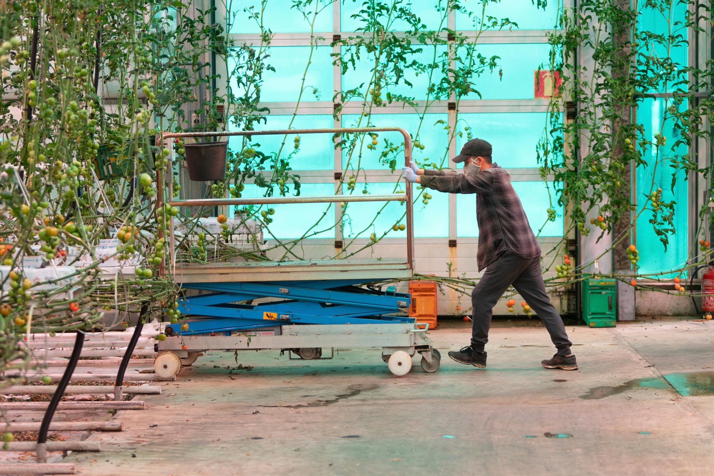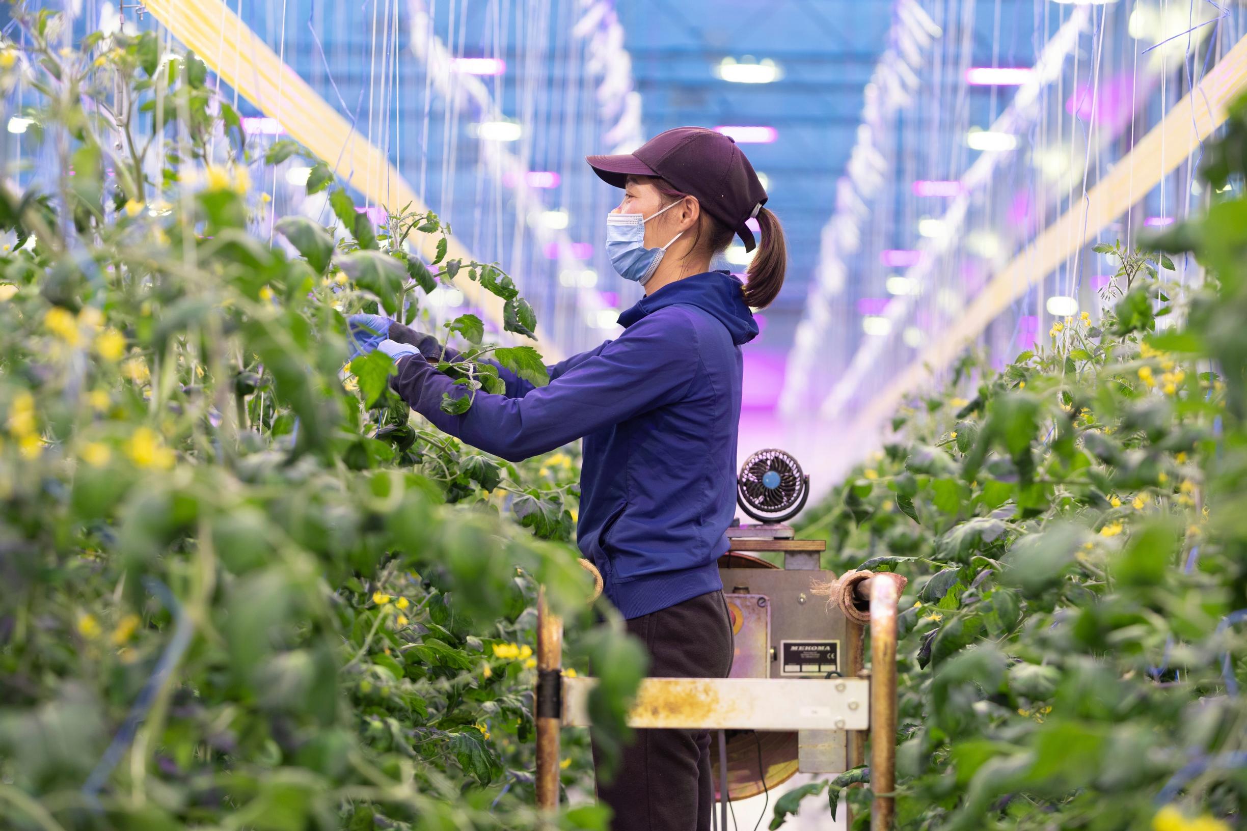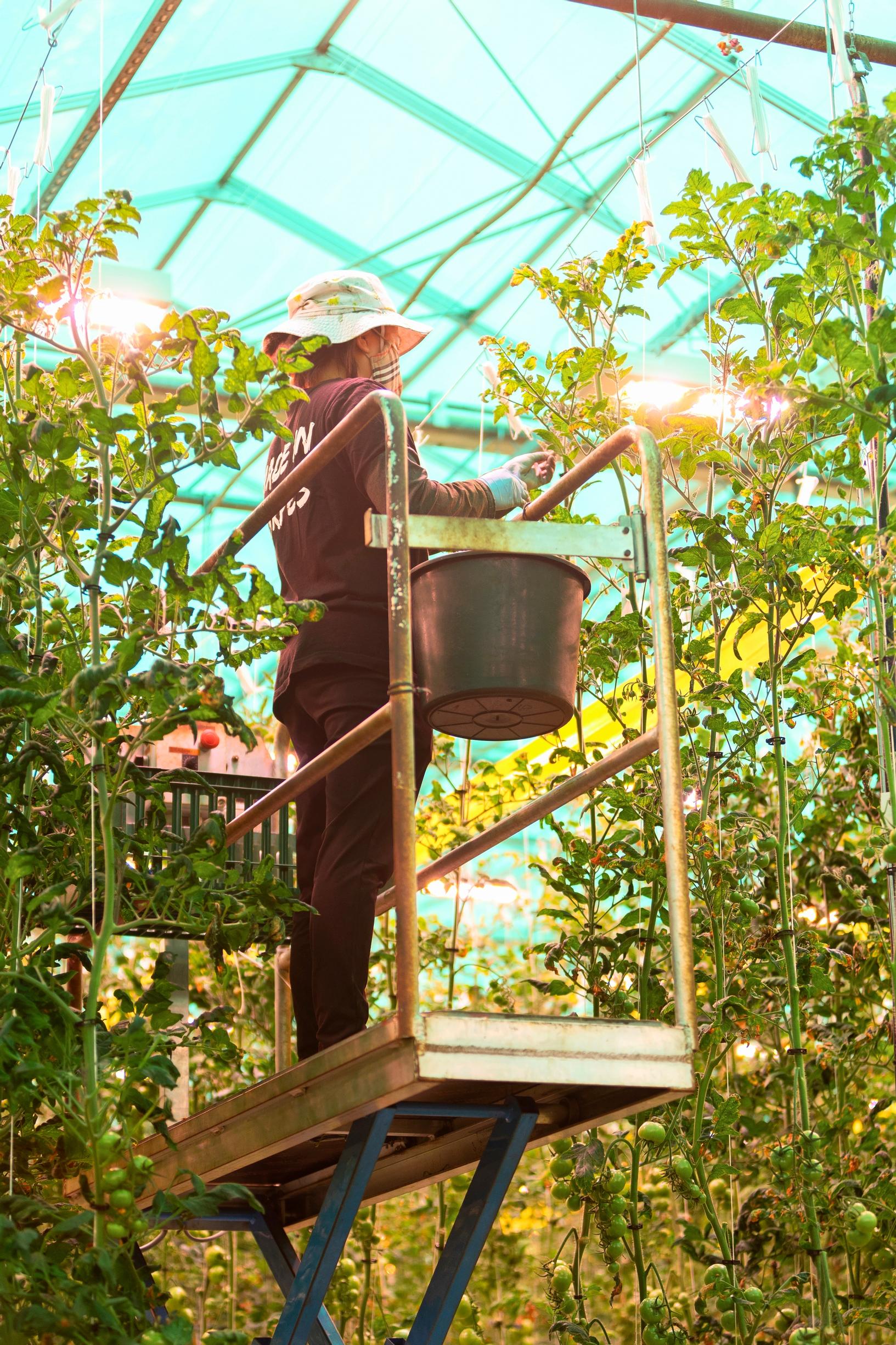 Oven takana avautuu toinen maailma. Kirkkaat led-valot tekevät värimaailmasta punertavan. Lämpöä on päiväsaikaan 23 astetta. Lämmitysjärjestelmän polttoaine on kauran kuori, myllyteollisuuden välituote. Tomaattitarha on siis hyvä esimerkki nykyaikaisesta kiertotaloudesta.