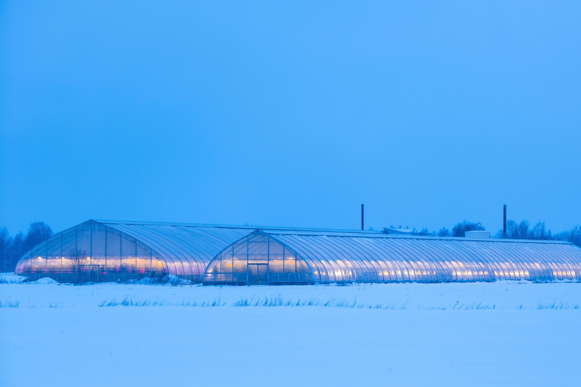 Vastaavia valoilmiöitä näkyy siellä täällä. Niitä tuottavat kymmenet kasvihuoneet, joissa kasvaa suurin osa Suomessa talvikaudella syötävistä tomaateista.