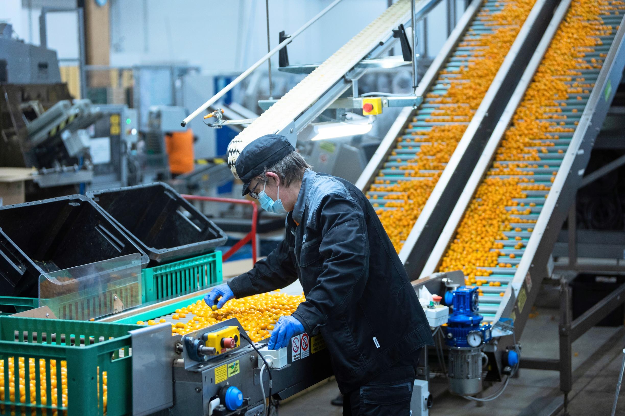 Pakkauslinjan ohittaa 150 000 tomaattia tunnissa. Jokainen tomaatti punnitaan ja kuvataan linjaston päällä olevalla kameralla laadun varmistamiseksi.