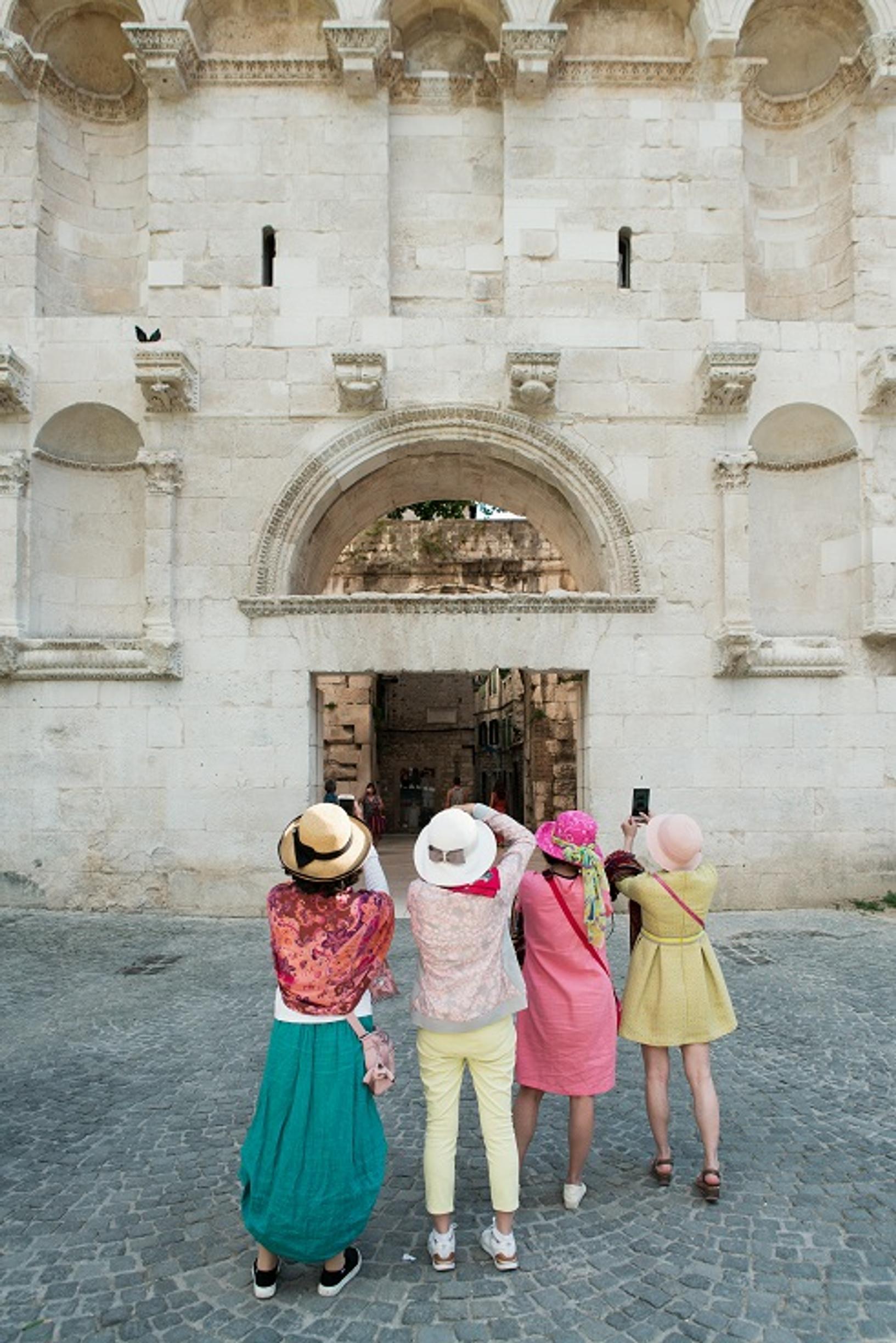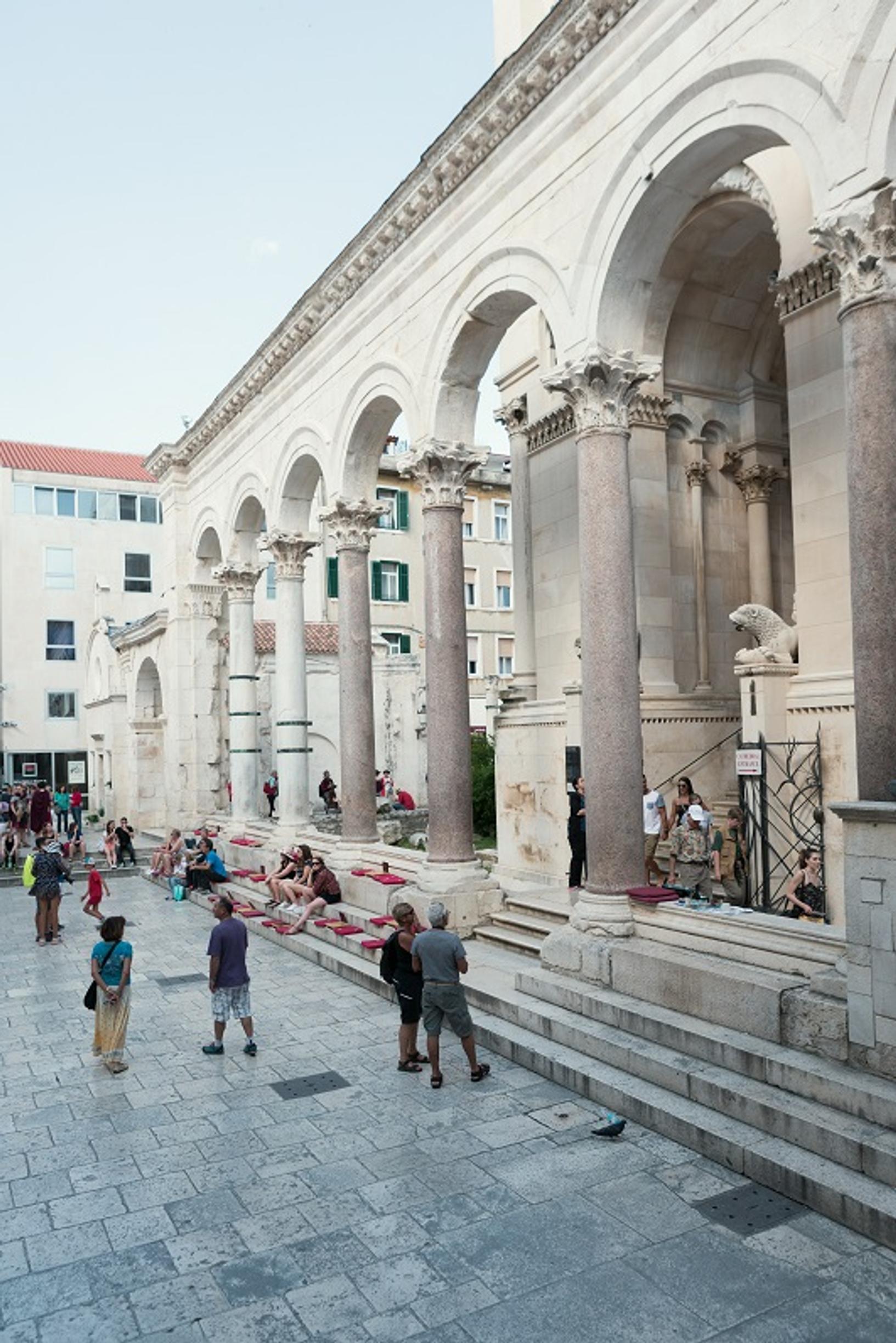 Morsiuspari ja monenkirjava hääseurue ovat halunneet ikuistaa ilonhetkensä Splitin kuuluisimmalla aukiolla, keskellä entistä Diokletianuksen palatsin aluetta. Peristilin aukio, palatsin hyvin säilyneet jäänteet ja niiden ympärille vuosisatojen varrella nousseet rakennukset muodostavat Splitin vanhankaupungin.