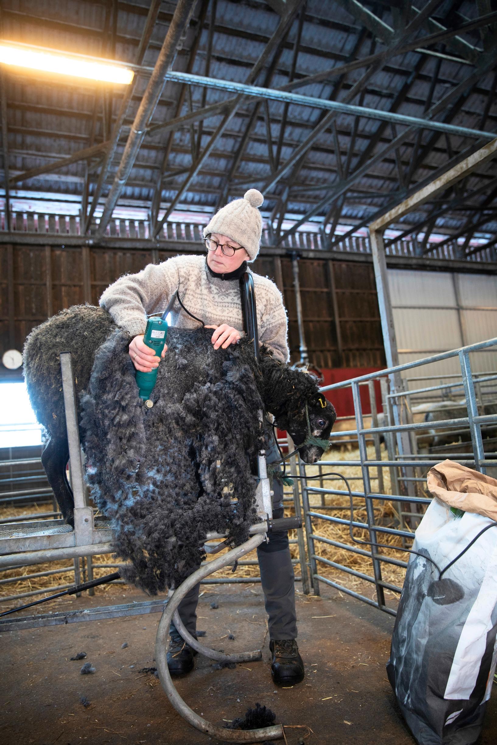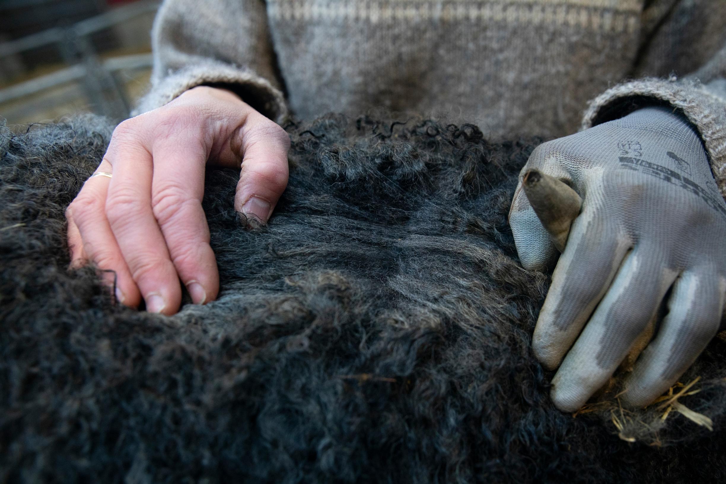 Musta pässi vaikuttaa uteliaan kiinnostuneelta uudesta tyylistään. Turkkia on vielä sen verran jäljellä, ettei ihan kylmä tule, mutta askel on keveämpi. Laine tarkistaa kerityn villan ja lajittelee sen laadun mukaan. Paras lanka syntyy pitkästä ja kiharasta villasta. Roskaiset ja huopuneet osat kelpaavat lähinnä juhannuskokkoon.