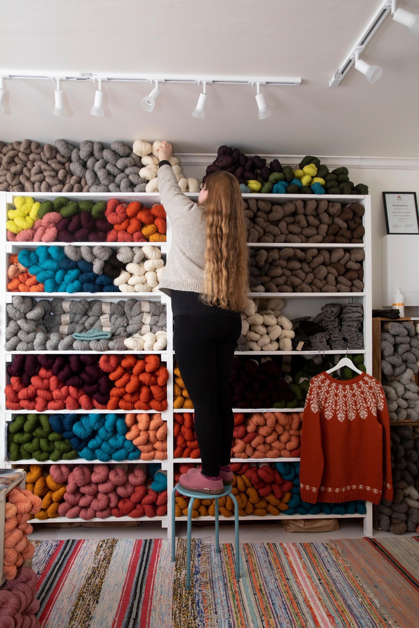 – Kaupaksi menee kaikki, jonka kehräämö pystyy valmistamaan. Joudun myymään paljon eioota. Jos joku tietty väri tai laatu puuttuu pitkään valikoimista, sitä odotetaan.