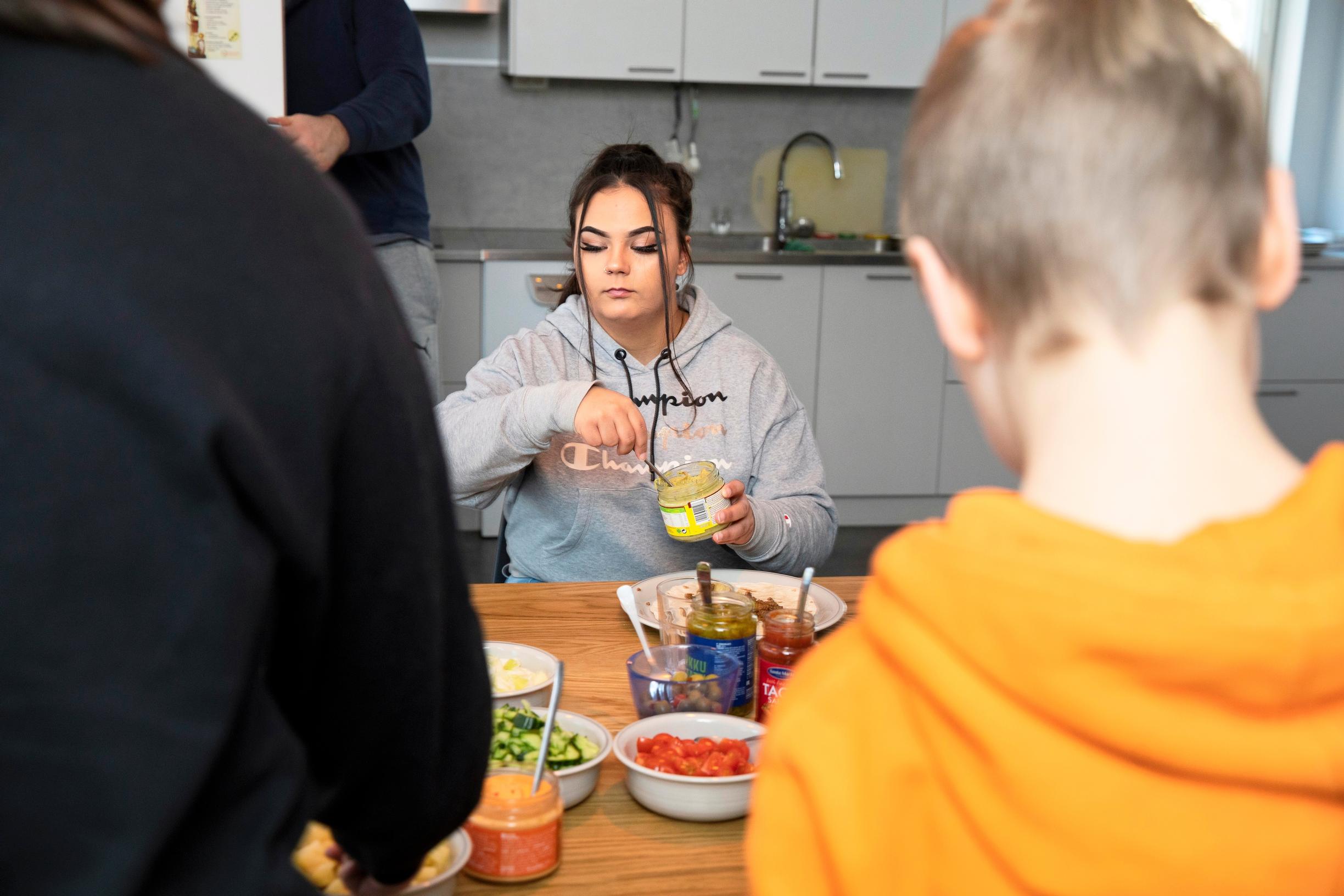 Keittiössä ruokaa laittaa ohjaaja Anneli Alkila. Hän on ollut talossa kutakuinkin 30 vuotta ja kädet pilkkovat tehokkaasti paprikaa tortillojen täytteeksi. Ruoka on aina neljältä, mutta jos joku haluaa syödä eri aikaan, sekin on ok. Kotitöitä tekevät kaikki, niin lapset kuin aikuiset.