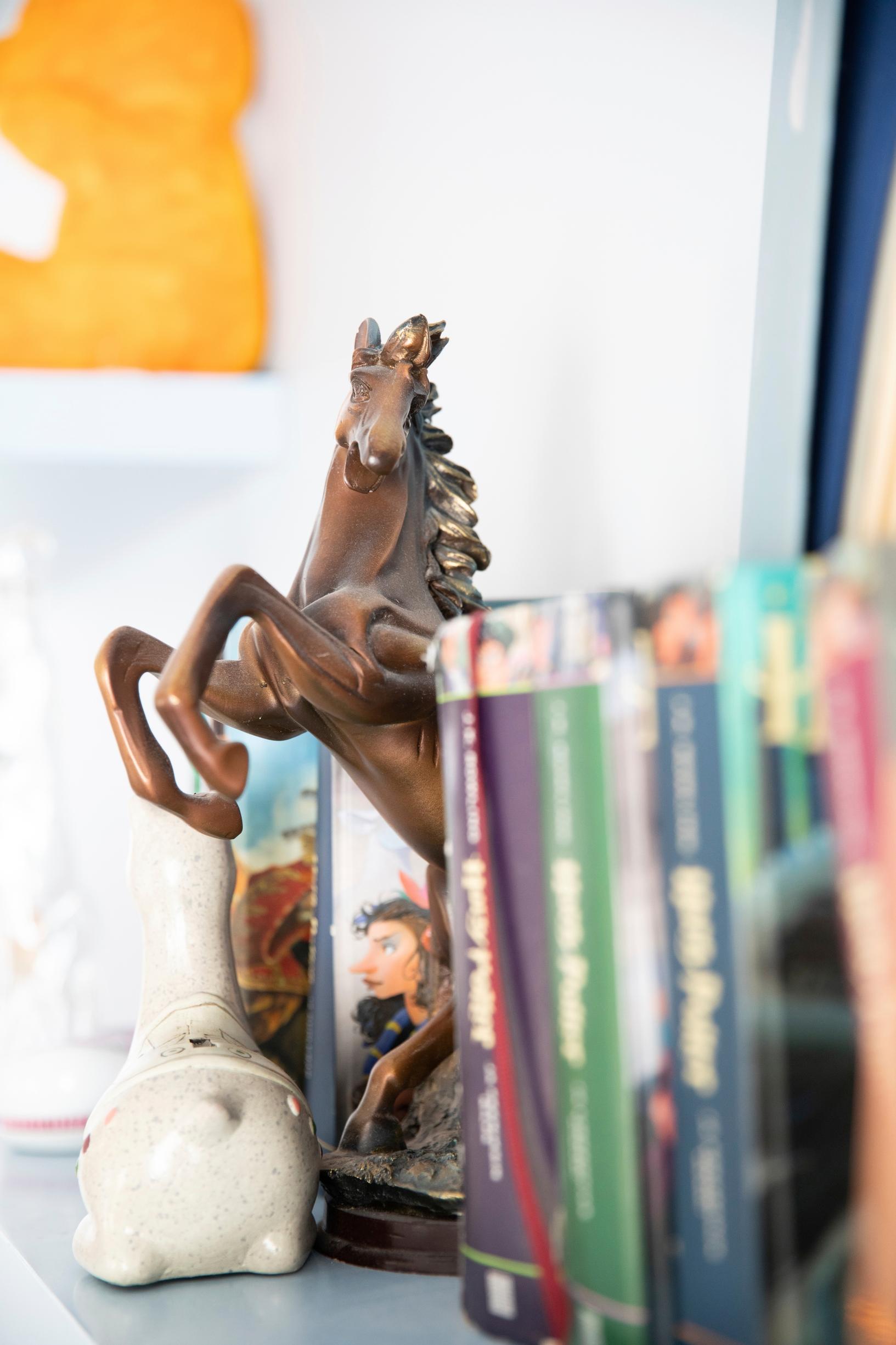Sitten yläkertaan! Siellä on Nadjan huone, johon kuuluu oma pieni kylpyhuone ja keittokomero. Nadja pahoittelee sotkua, jota on kyllä vaikea nähdä. Katossa on unisieppari hevoskuvalla, hyllyillä muutama Harry Potter.