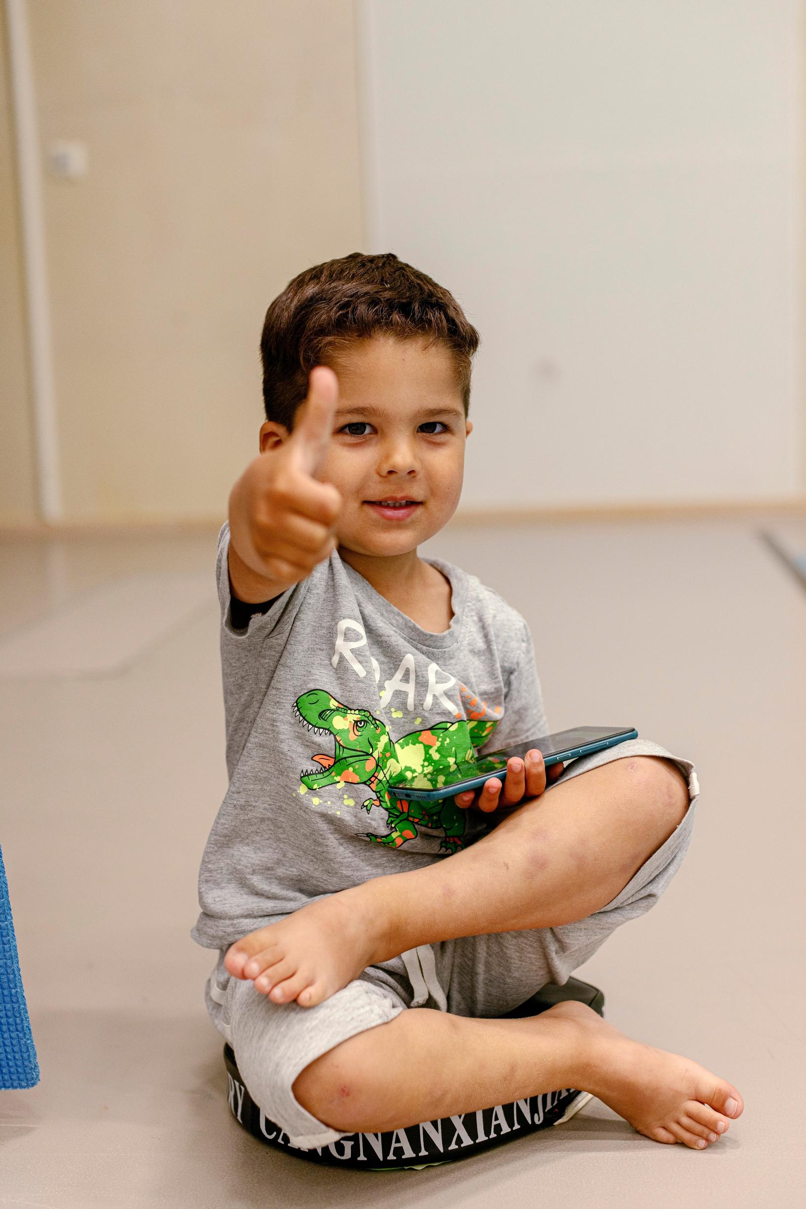 Myös seinää vasten käsillään seisova energinen Taika, 8, pitää karatetreeneistään.