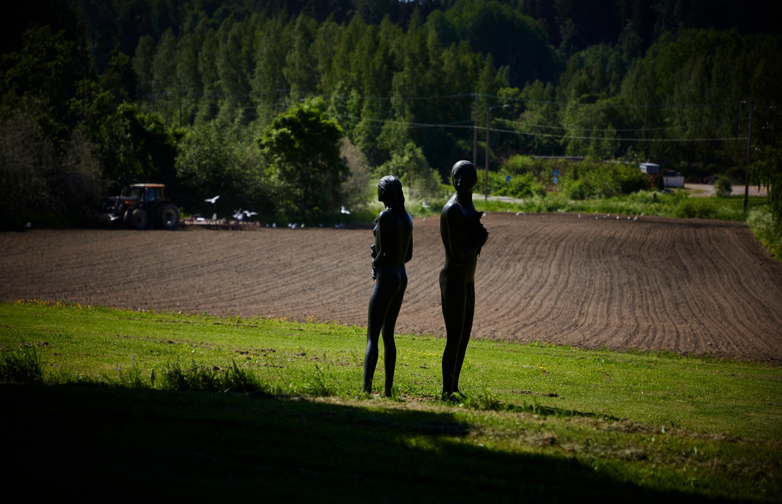 Vierailijat lähestyvät kartanoa alaviistosta ja näkevät ensimmäisenä kaksi pronssista ihmisfiguuria, toisiinsa selin seisovan naisen ja miehen (Viimeiset, 1970). He ovat ihmislajin viimeiset edustajat – kuin Aatamin ja Eevan lopunajan vastine. Hahmojen käsissä on kuolevia kukkia. Tuntuupa lohduttomalta.