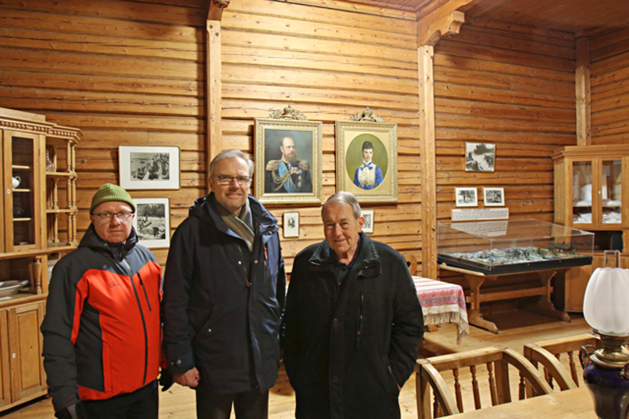 Keisarillisen kalastusmajan vahtimestari Ari Viheriäluoto (vas.), Langinkoskiseuran puheenjohtaja Pentti Leisti ja hallituksen jäsen Kari Alanko miettivät majan kohtaloa sen salissa.