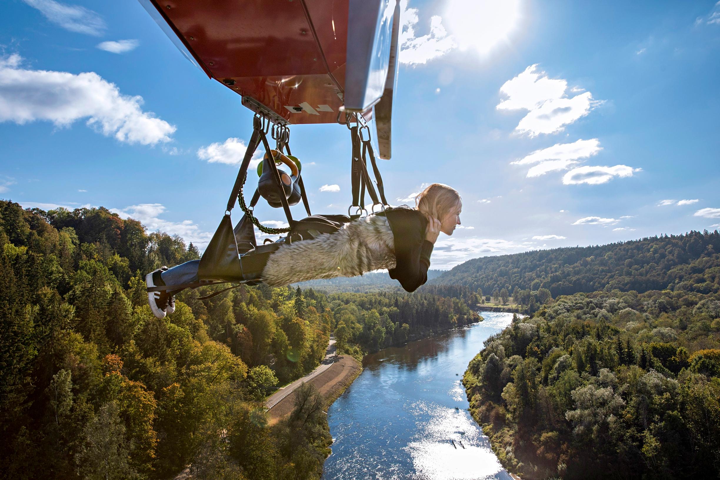 Alapuolella leviävät Latvian Siguldassa sijaitsevan Gaujan laakson vehreät maisemat. Ne voi ylittää täällä myös toisenlaisella ilmalennolla, vaijerin varassa kulkevan keltaisen rata-auton kyydissä. Mutta vatsallaan valjaissa roikkuen kokemus on muutamaa astetta ikimuistoisempi.