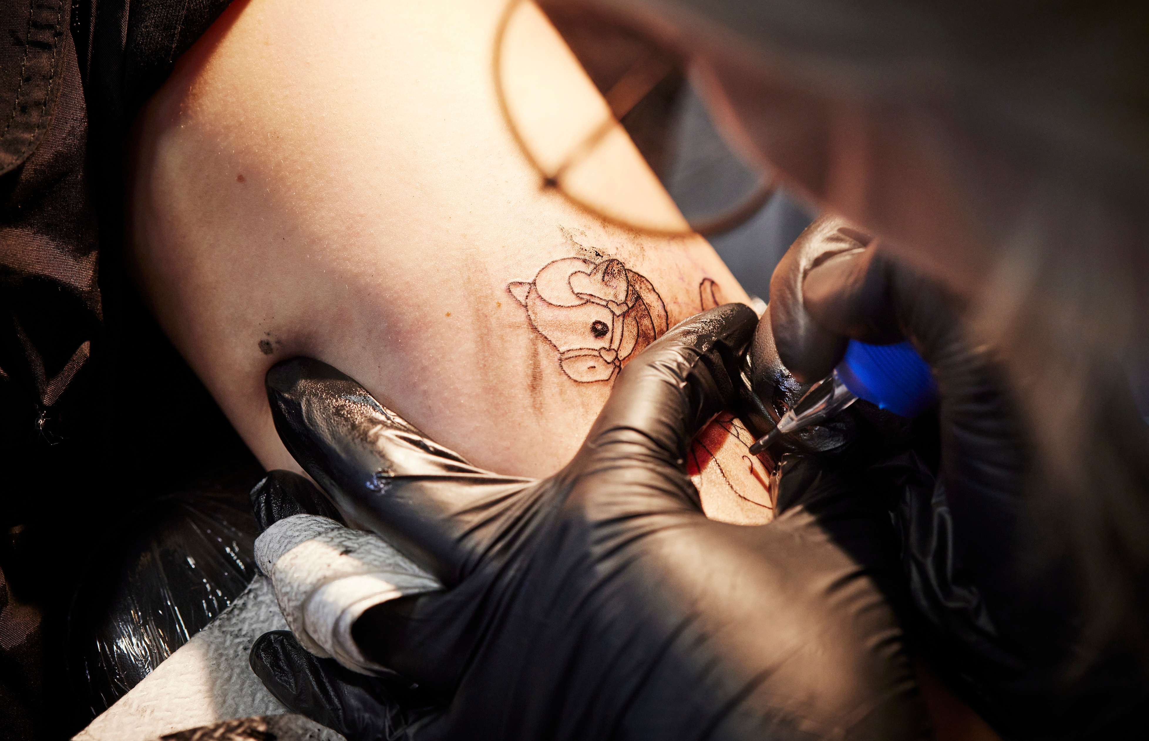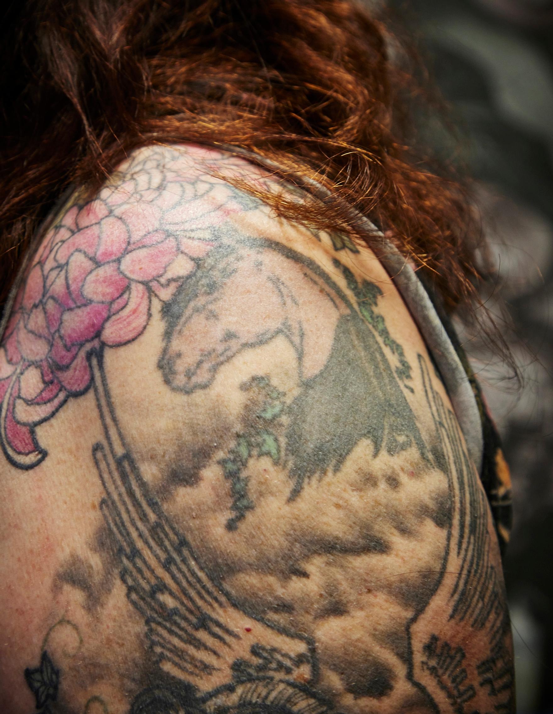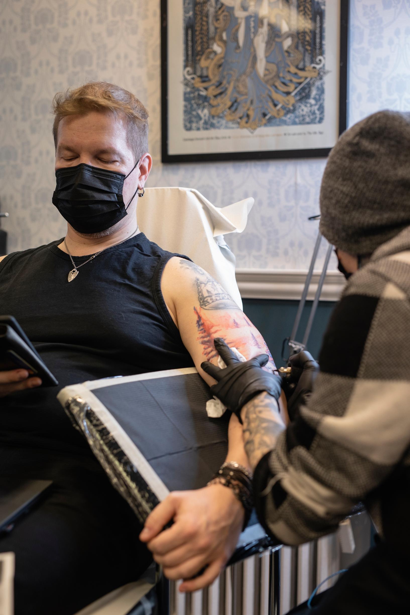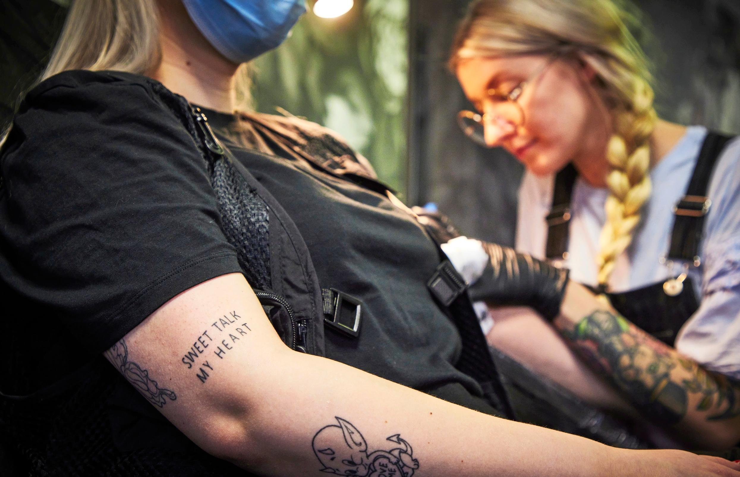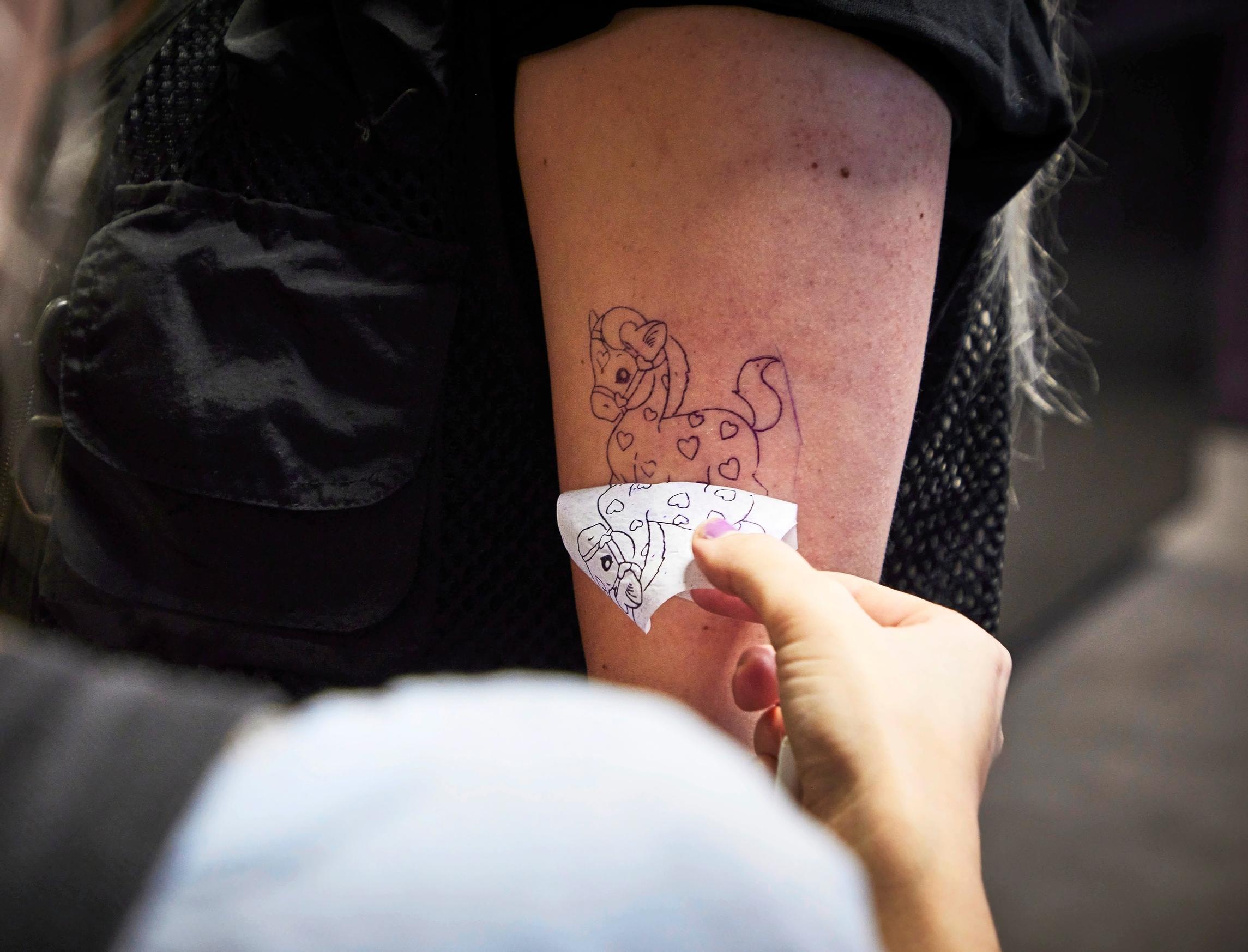 Nyt 29-vuotias Holopainen tatuoi viereisellä penkillä Sara Kainulaisen, 22, olkavarteen ponia. Tatuointi on Kainulaisen kymmenes. Ensimmäisen, pienen ruusun kylkiluuhun, hän otti heti täytettyään 18 vuotta.