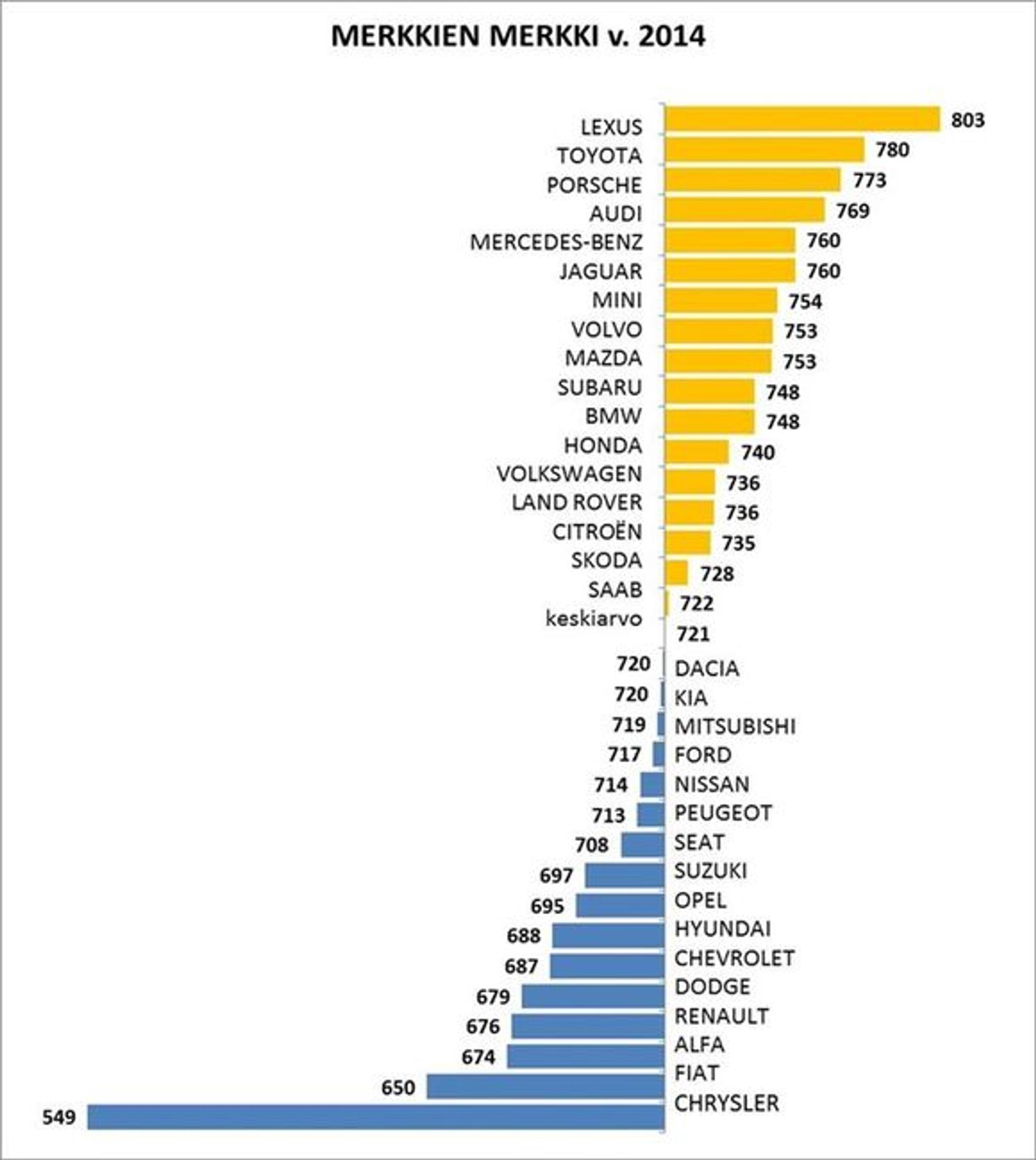 Lexus otti takaisin kärkipaikan merkkinä, jolla on tyytyväisimmät omistajat. Lexuksen vahvuuksina olivat palvelut sekä niiden korkeatasoinen laatutaso, joka säilyy vakaana myös autojen ikääntyessä.