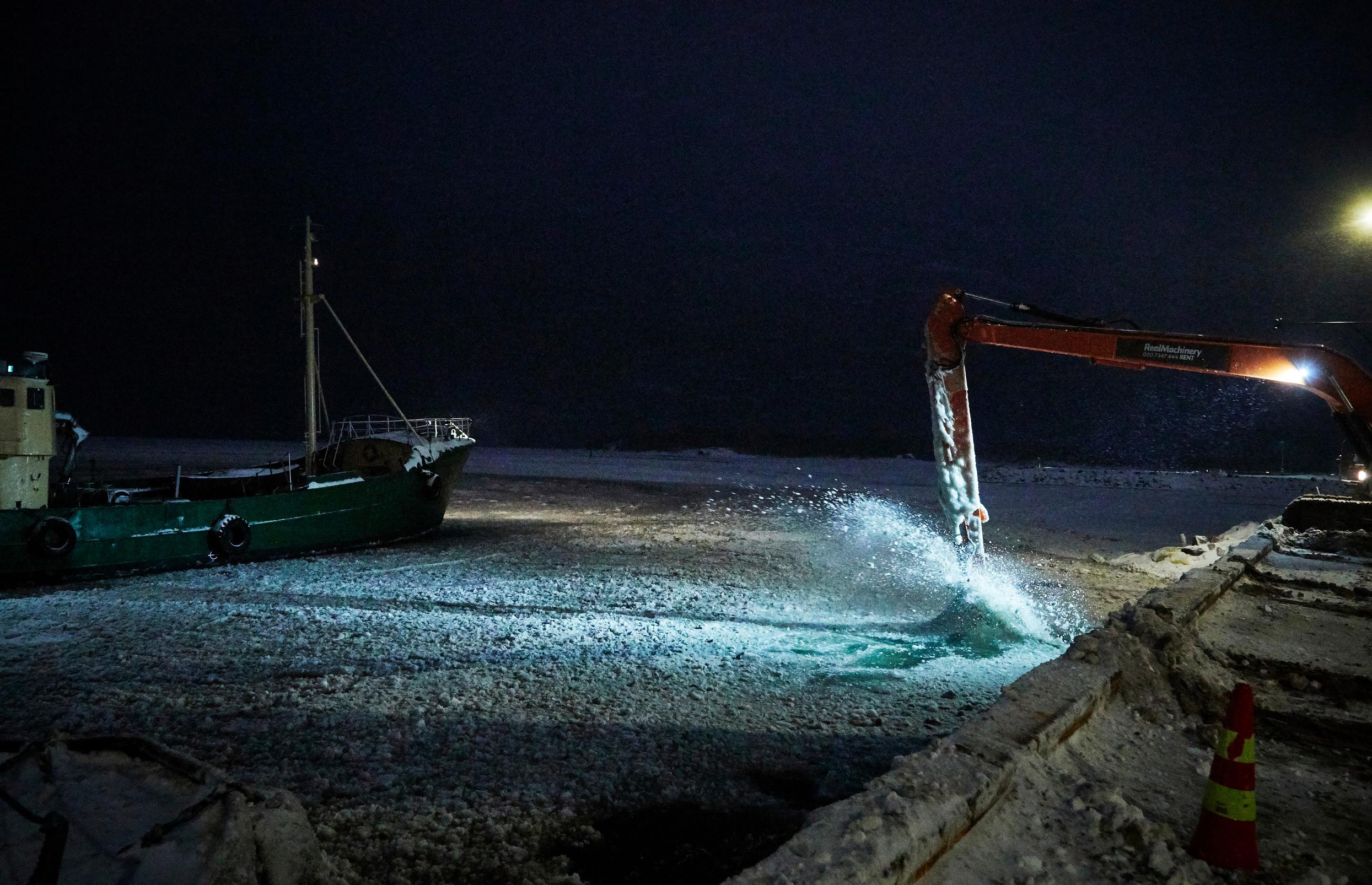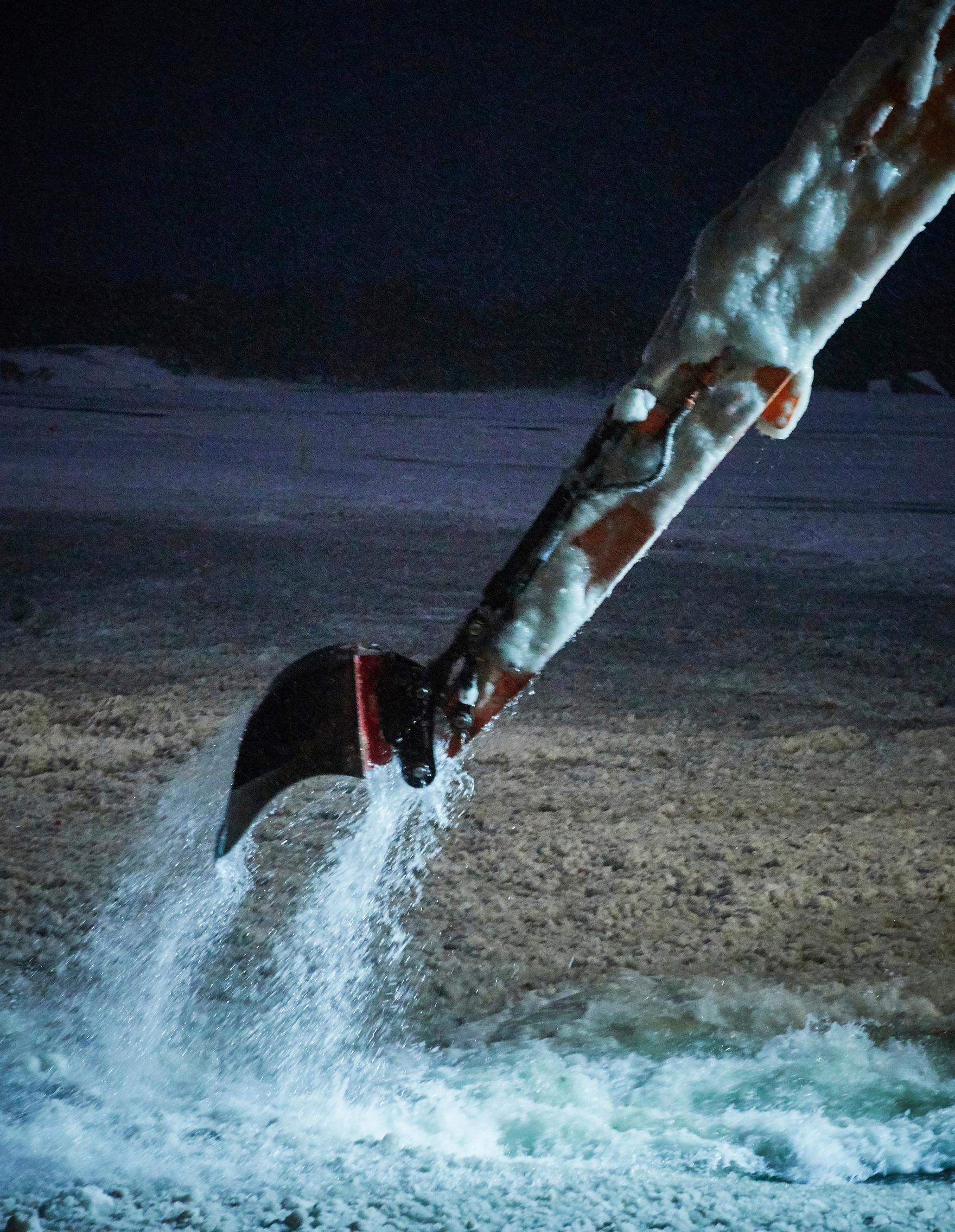 Vaikka ulkona on pakkasasteita vain viisi, Etelä-Helsingin äärimmäisellä rantaviivalla Hernesaaressa tuuli viiltää kylmästi. Kuorma-autot kippaavat lunta mereen laiturin reunalta, ja vedessä pienehkö Carmel-alus pitää merenpintaa auki potkurivoimalla. Samaa tekee laiturille pysäköinyt keltainen kaivinkone, jonka kauha pyörii tasaisesti meressä.