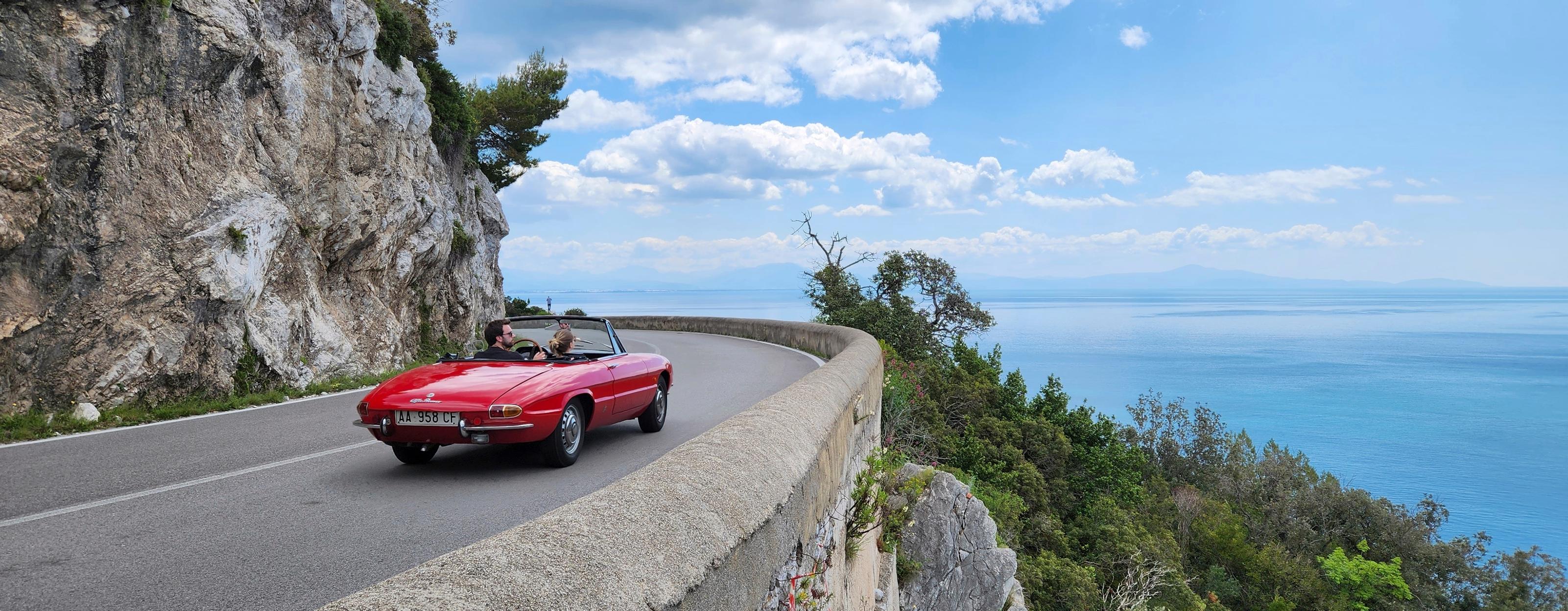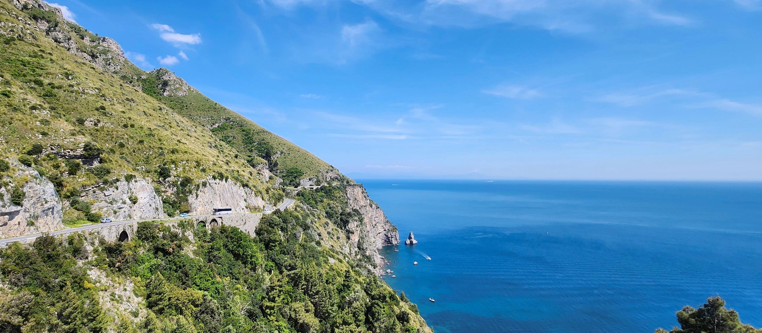 Amalfin niemi kurkottaa Napolin eteläpuolella länttä kohti pulleana sormena. Vuoristoinen maa putoaa jyrkkänä kohtisuorana rinteenä Välimereen. Sen rantoja seuraileva, jo olemassa olevia tai rakennettuja penkereitä hyödyntävä Nastro Azzurro on yksi maailman kuuluisimmista teistä. Se nousee aina eri listauksissa kolmen kauneimman tien joukkoon – ja ne kaksi muuta vaihtuvat aina, mutta Amalfin tie ei koskaan.