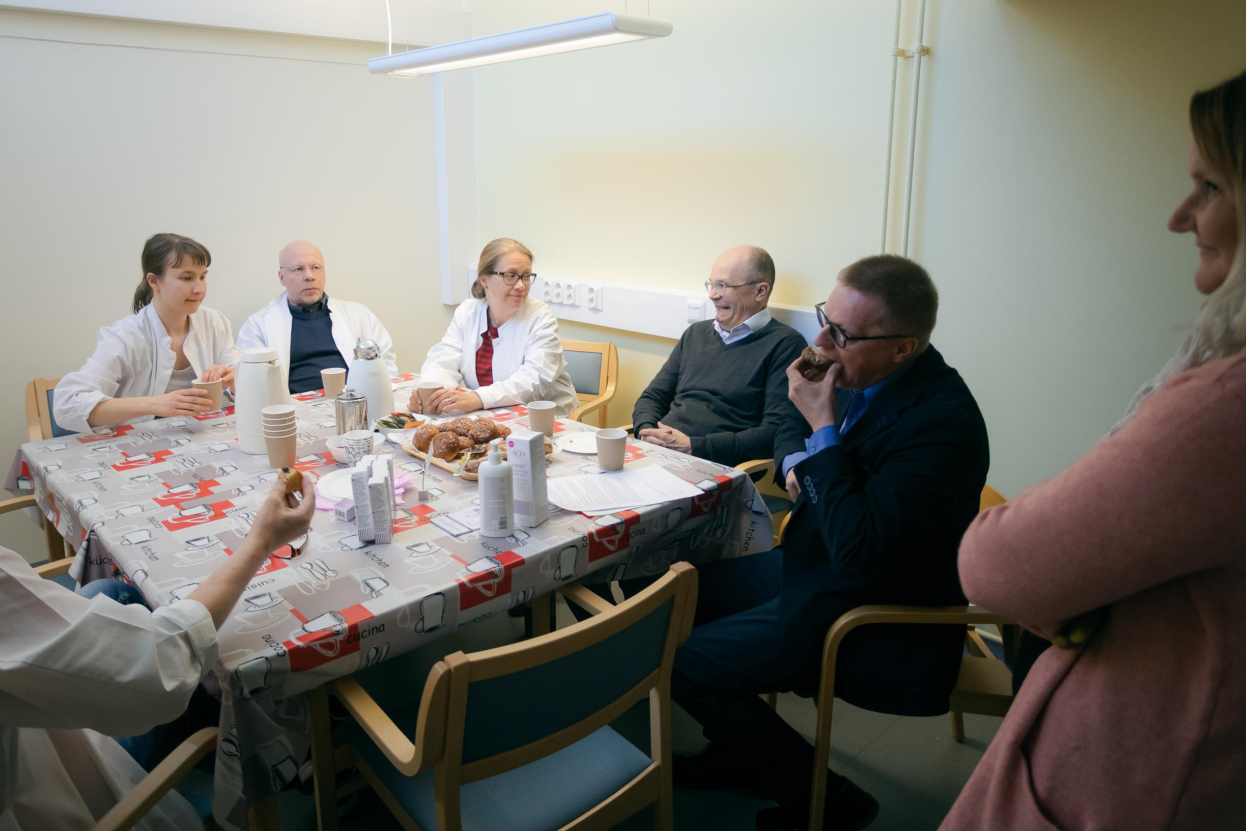 Kun kävelemme näytteenoton ohitse, potilas pysäyttää Kiminkisen ilahtuneena.